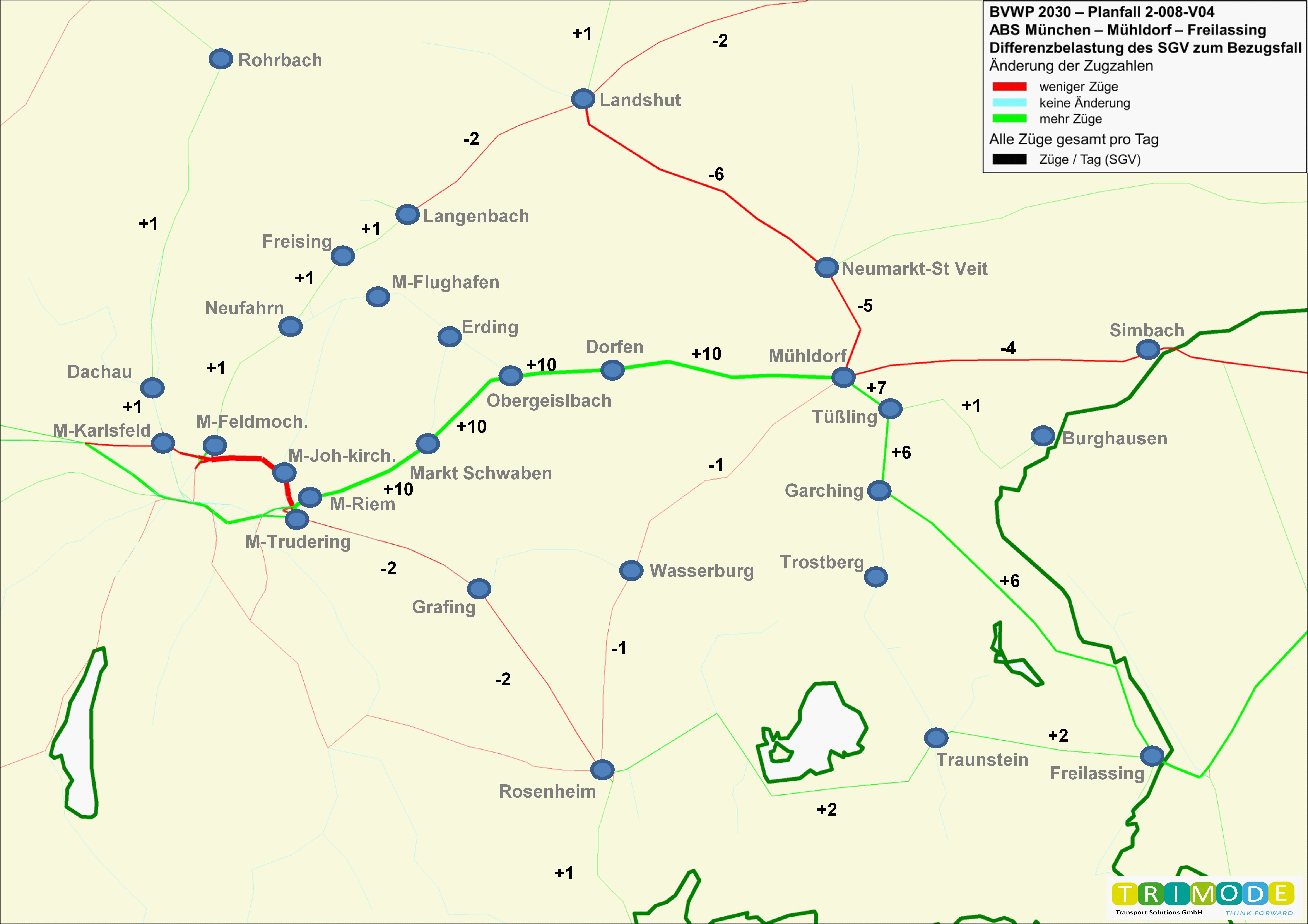 ![]() Differenzbelastung in SGV-Zügen/Tag zwischen Planfall 2-008-V04 und Bezugsfall ABS 38 plus |