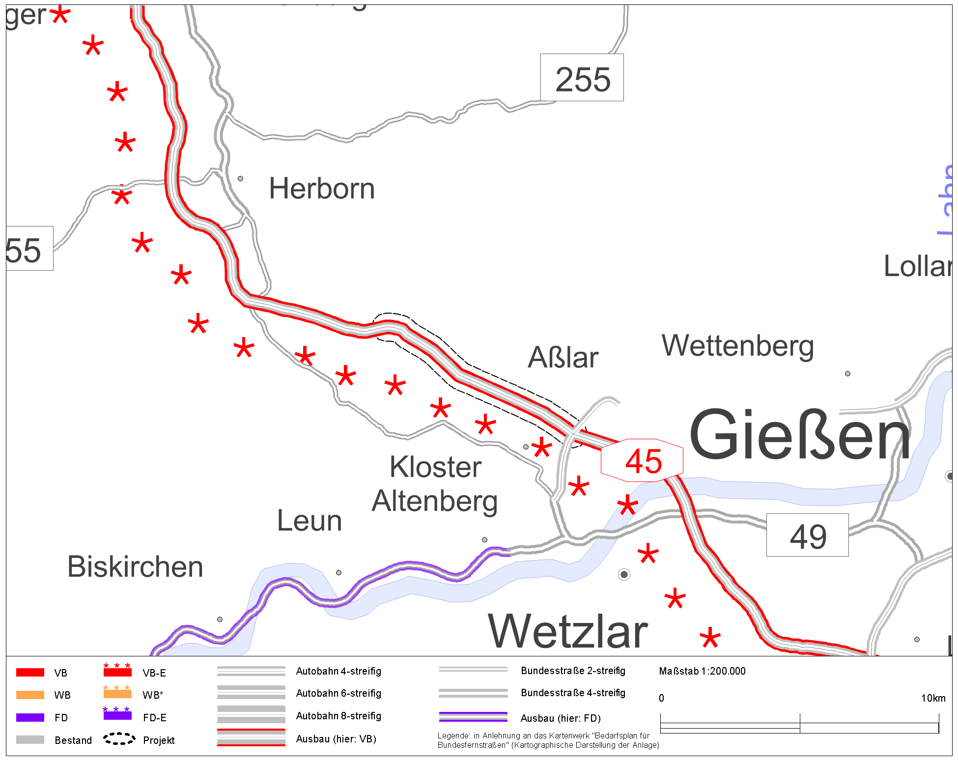 | Bei dem über 7 km langen Ausbauprojekt führt die Trasse über stark bewegtes Relief von nördlich Ehringhausen bis Asslar, hauptsächlich entlang von großflächigen zusammenhängenden Wäldern. Im Bereich des Baubeginns liegt die Trasse im Nahbereich eines Vogelschutzgebiets. Ein FFH-Gebiet mit mehreren Teilflächen befindet sich ebenfalls in der Wirkzone des Vorhabens. Für beide Natura 2000-Gebiete können erhebliche Beeinträchtigungen nicht ausgeschlossen werden. | |