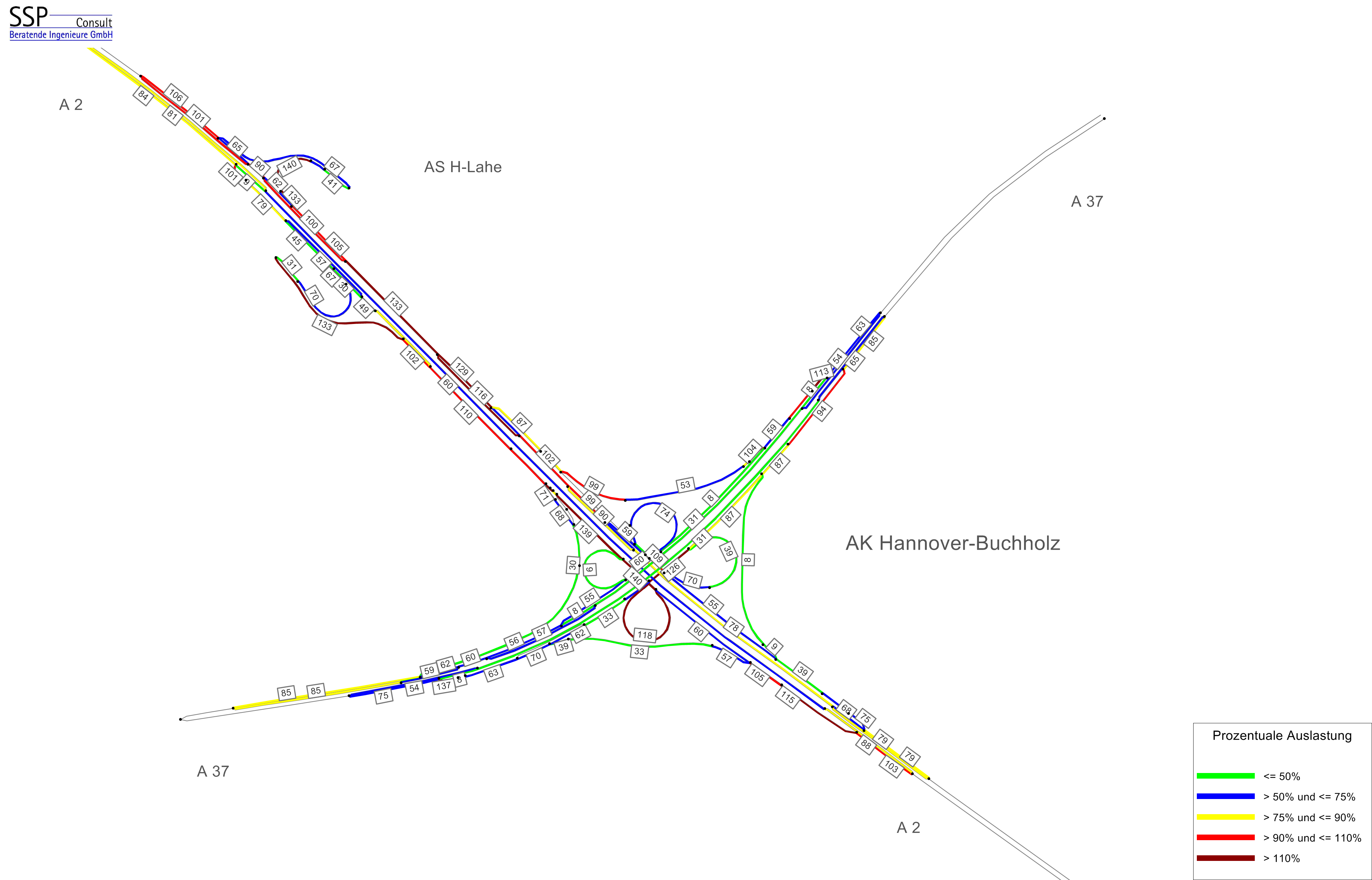 | Abb. 7: Auslastung in der Spitzenstunde im Planfall 2030 (Pkw-Einheiten/Elementkapazität) [%] |