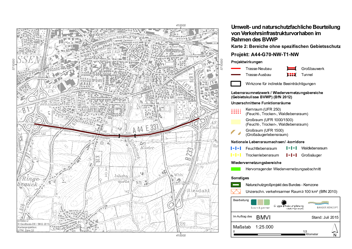 | Das Ausbauprojekt verläuft am südlichen Siedlungsrand von Unna. Südlich der Trasse liegen größere Ackerflächen. Am östlichen Bauende befindet sich ein großflächiges VSG. Dieses liegt randlich innerhalb der Wirkzone des Vorhabens. Erhebliche Beeinträchtigungen können jedoch nicht vollständig ausgeschlossen werden. Hervorragende Wiedervernetzungsabschnitte sind nicht betroffen. | |