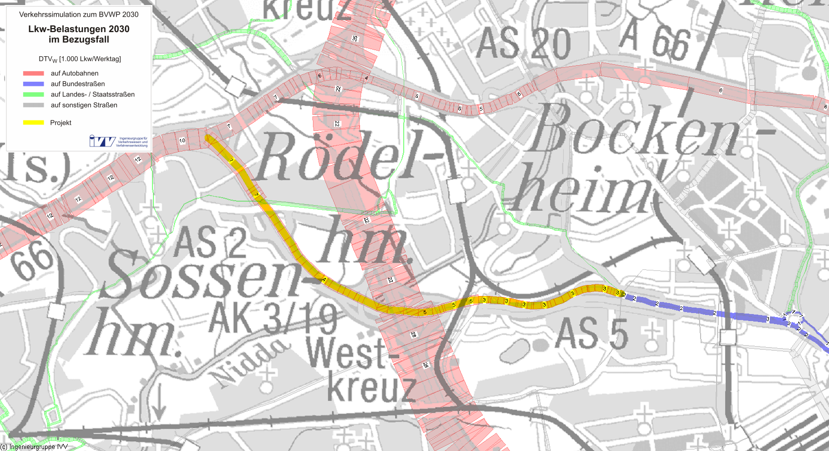 | Ausbauprojekt im westlichen Stadtgebiet von Frankfurt. Nördlich der Trassierung liegt ein kleinflächiges Waldgebiet (Biegewald), teilweise auch ackerbauliche Nutzungen. Es bestehen keine Konflikte zu den betrachteten Umweltkriterien. | |
