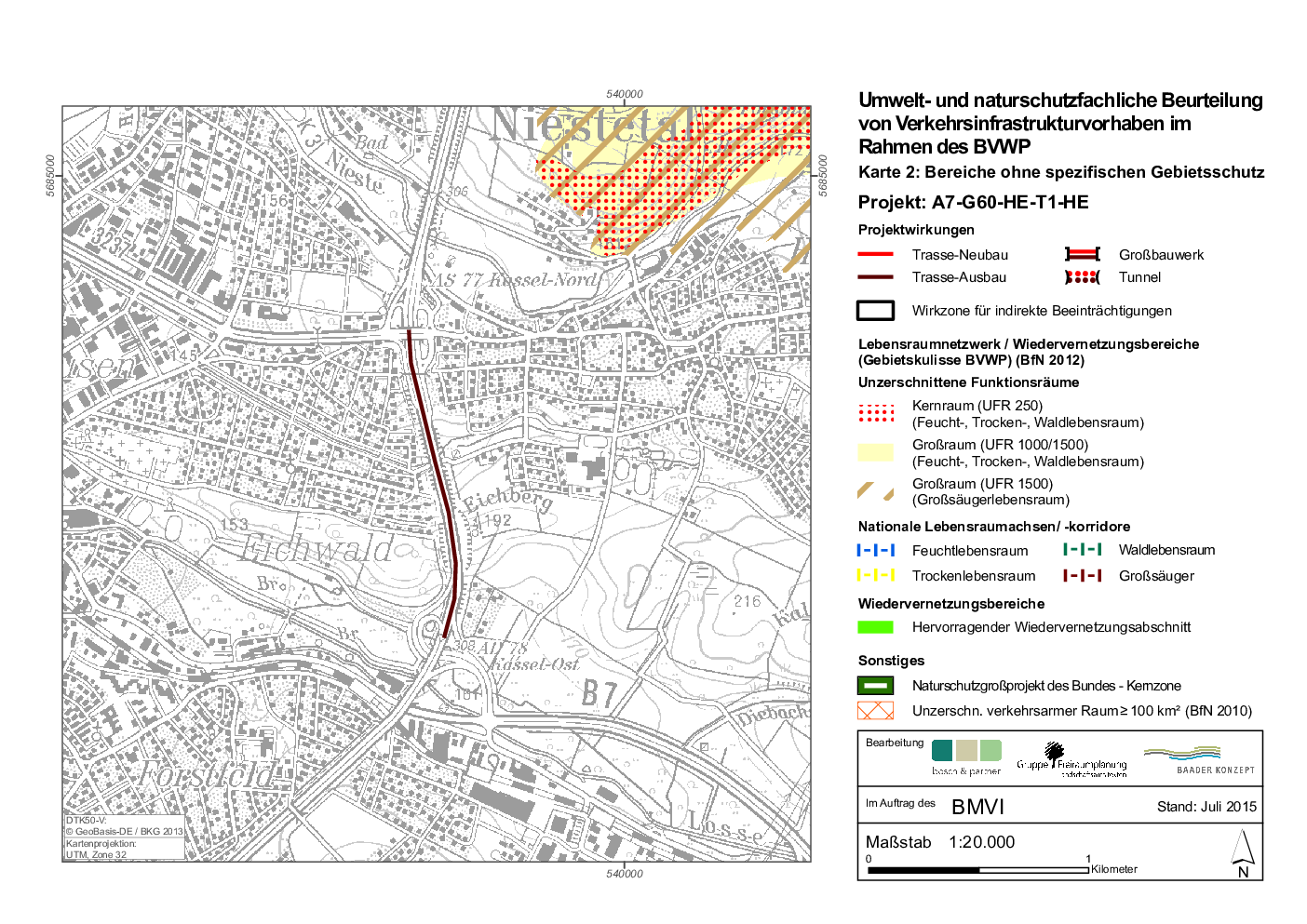 | Der Ausbauabschnitt verläuft von AD Kassel-Ost Richtung AS Kassel-Nord siedlungsnah durch Grün- und Ackerland sowie vorbei an einem Wald ("Eichwald") in stark bewegtem Relief. Von dem Ausbau sind keine Natura 2000-Gebiete oder WVA betroffen. | |