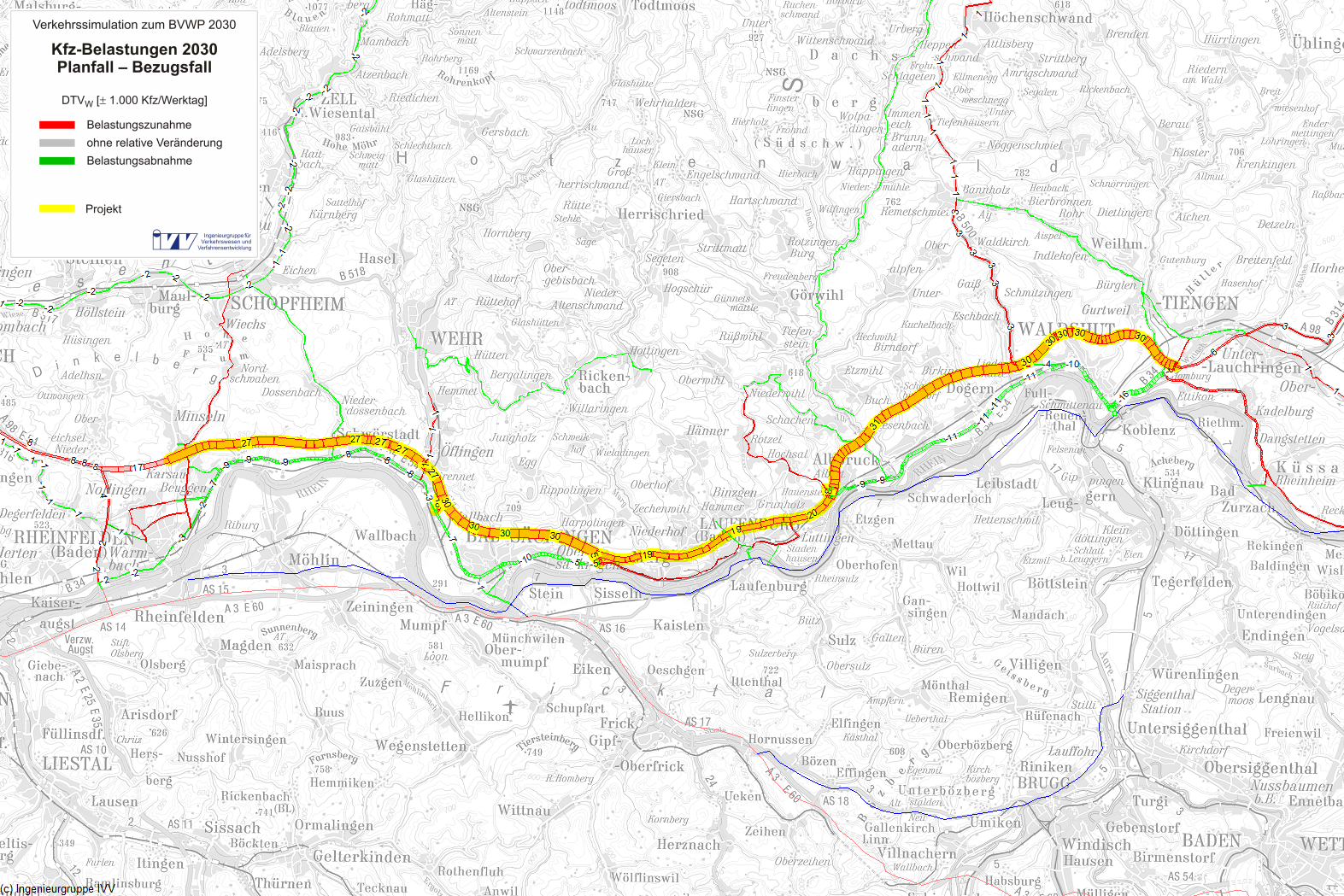 Im Raum südlicher Schwarzwald, Hochrhein besteht derzeit keine leistungsfähige West-Ost-Verbindung. Es bestehen erhebliche Erreichbarkeitsdefizite. Mit dem Bau der A98 werden zwei Ziele verfolgt: Zum einen die leistungsfähige überregionale Anbindung der Raumschaft in Form eines internationalen Lückenschlusses zwischen BAB A5 und BAB A81 mit direkten Anbindungen nach FR und CH. Zum anderen eine effiziente Entlastung der heute massiv überlasteteten und verkehrssicherheitsmäßig nicht mehr akzeptablen bestehenden B34 (DTV_2010: 25.000 Kfz/24h, SV 11%). Insbesondere in den 11 Ortsdurchfahrten zwischen Rheinfelden und Waldshut ist die Gesamtsituation nicht mehr vertretbar (Lärm, Schadstoffe, Verkehrssicherheitsdefizite). Die A98 wird verkehrlich sehr wirksam sein und die Verkehre der Raumschaft bündeln (Prognose DTV_2030: 18.000 - 27.000 Kfz/24h, SV 20%) (Gutachten ptv, 2013).