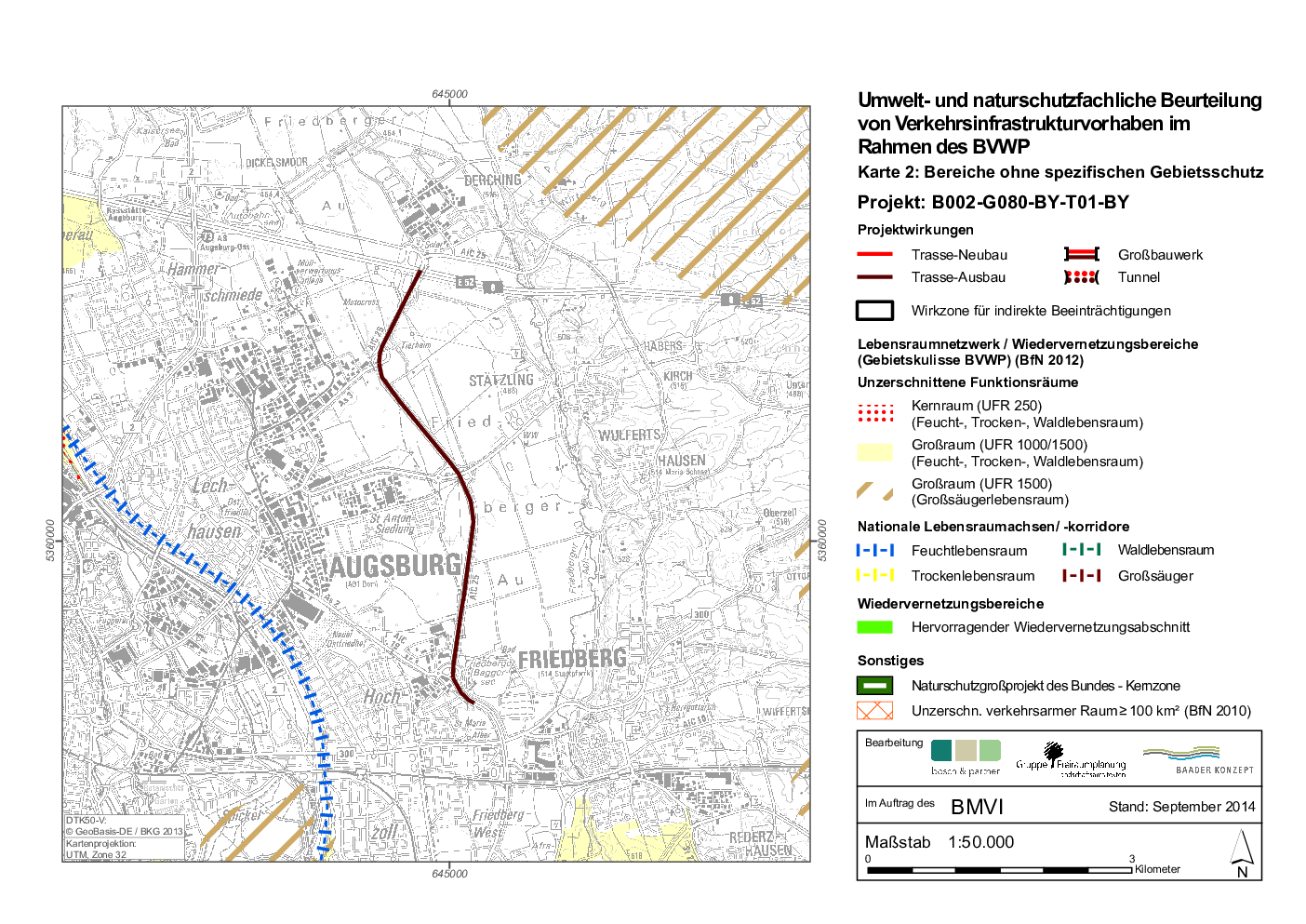 | Das Ausbauprojekt verläuft östlich von Augsburg über stadtnahes, landwirtschaftlich genutztes, ebenes Gebiet. Natura 2000-Gebiete und Wiedervernetzungsabschnitte sind nicht betroffen. | |