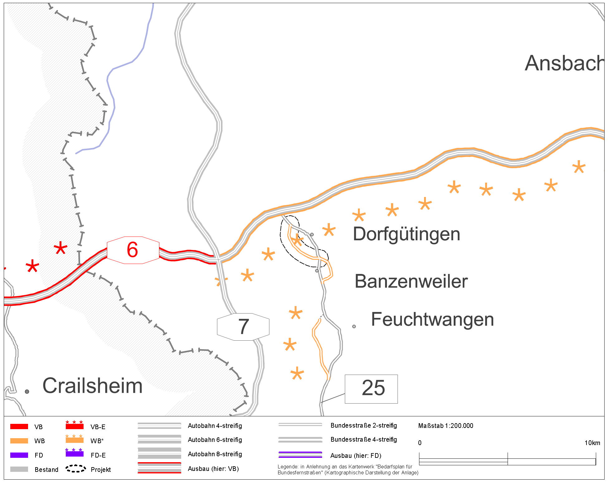 1. Verbesserung der Verkehrsqualität auf der B 25, Dinkelsbühl – A 6 (AS Feuchtwangen-Nord) durch den im Westen von Dorfgütingen verlaufenden, geplanten einbahnigen, zweistreifigen Ausbau. 2. Der Durchgangsverkehr in Dorfgütingen ist mit über 90 % sehr hoch. Durch die OU wird die 0,65 km lange OD um über 90 % entlastet (DTVw von 6.154 Fz/24h, davon 775 Kfz/24h Schwerverkehr (SVZ 2010)).