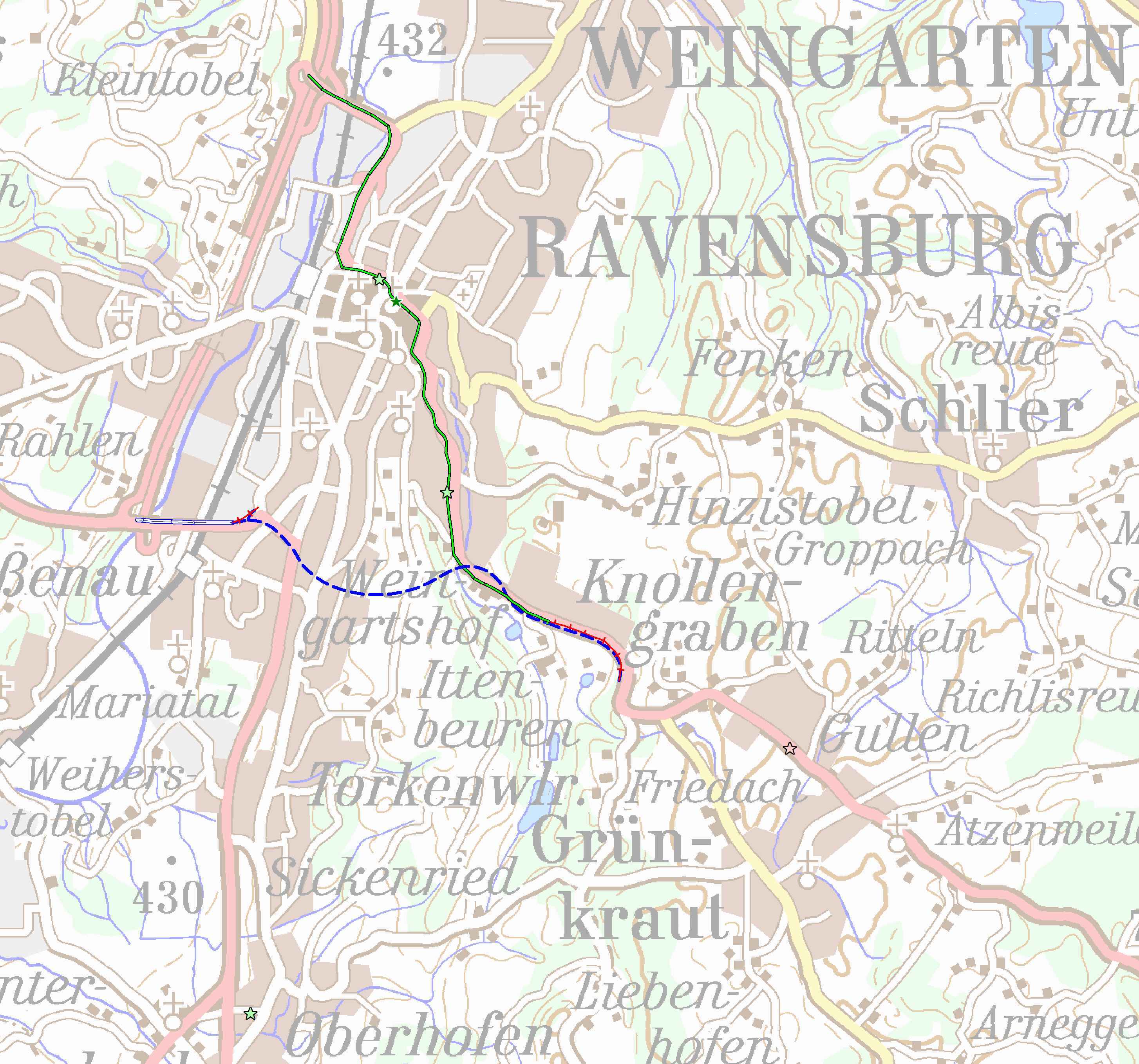 | Das Neubauprojekt der OU Ravensburg verläuft im Siedlungsbereich mit teilweise stark bewegtem Relief. Der Großteil der Strecke wird über einen geschlossenen Tunnel geführt. Im östlichen Streckenbereich verläuft die Trasse in einem Großraum für Feuchtlebensräume sowie einem Großsäugerfunktionsraum. Weitere Bereiche mit besonderen Umweltqualitäten sind nicht betroffen. | |