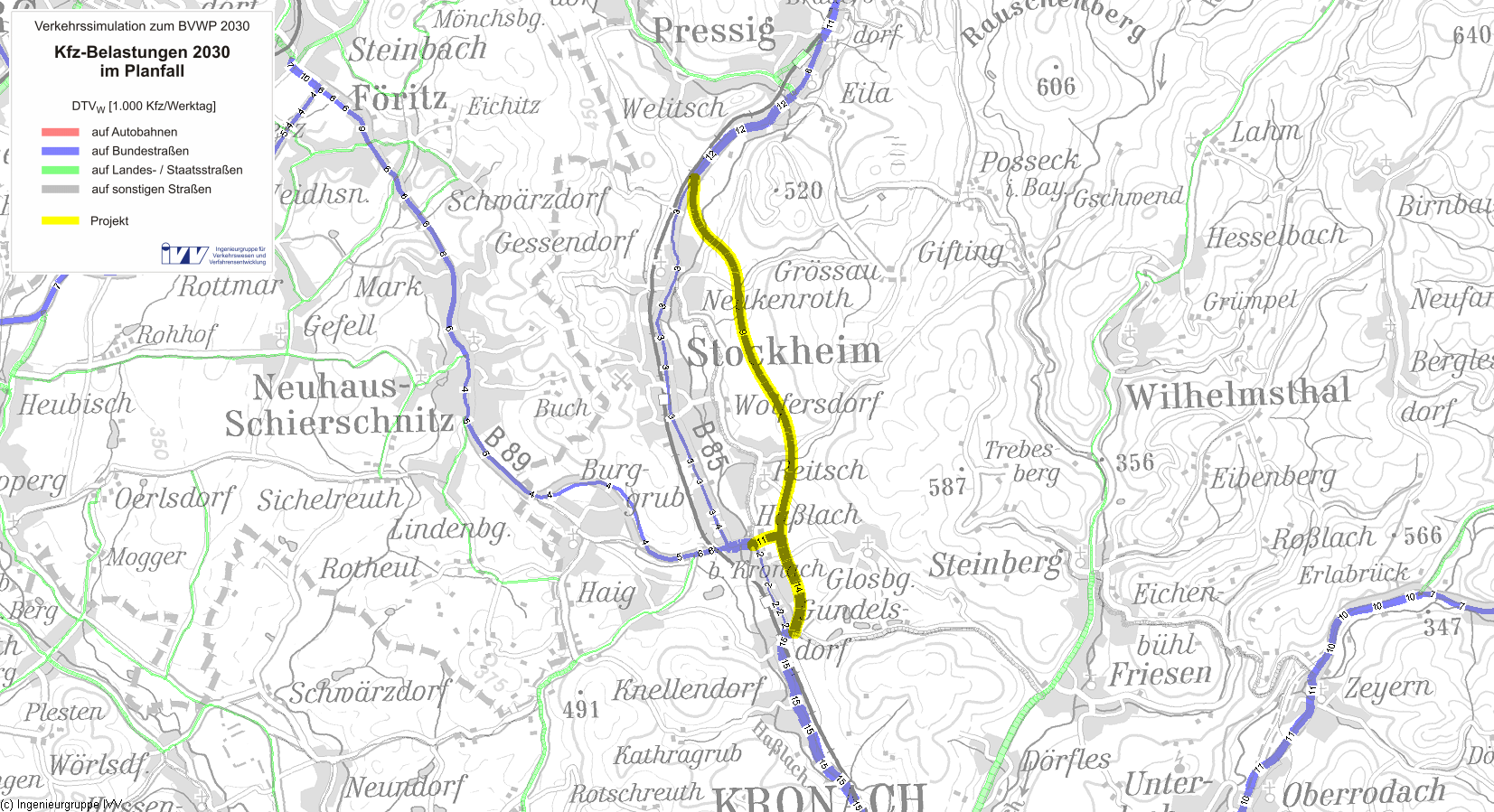 Entlastung der Ortsdurchfahrten von Gundelsdorf, Hasslach, Stockheim und Neukenroth. Herausnahme des Durchgangsverkehrs aus den mit ca. 4,4 km sehr langen Ortsdurchfahrten, der seit der Wiedervereinigung 1989 stark angestiegen ist (DTV2010 von 11.153 bis 13.229 Kfz/24h, SV-Anteil 8,5 %). Dadurch ergibt sich eine Verbesserung der Verkehrsqualität für den Durchgangsverkehr: Durch die entfallende Geschwindigkeitsbegrenzung innerhalb der Ortsdurchfahrten ergibt sich ein erheblicher Zeitgewinn für den Durchgangsverkehr. Bei Verwirklichung des Gesamtprojektes wäre der Streckenabschnitt der B 85 zwischen Förtschendorf und Kronach (ca. 18,5 km) frei von Ortsdurchfahrten