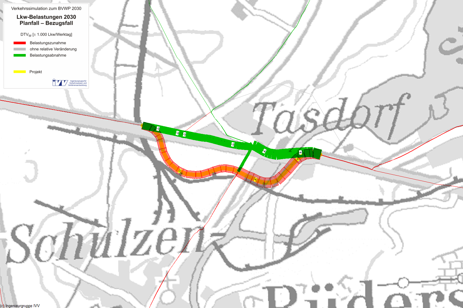 | Abb. 6: Querschnittsbezogene Kfz-Belastungsdifferenzen des DTVw zwischen dem Planfall und dem Bezugsfall 2030 |