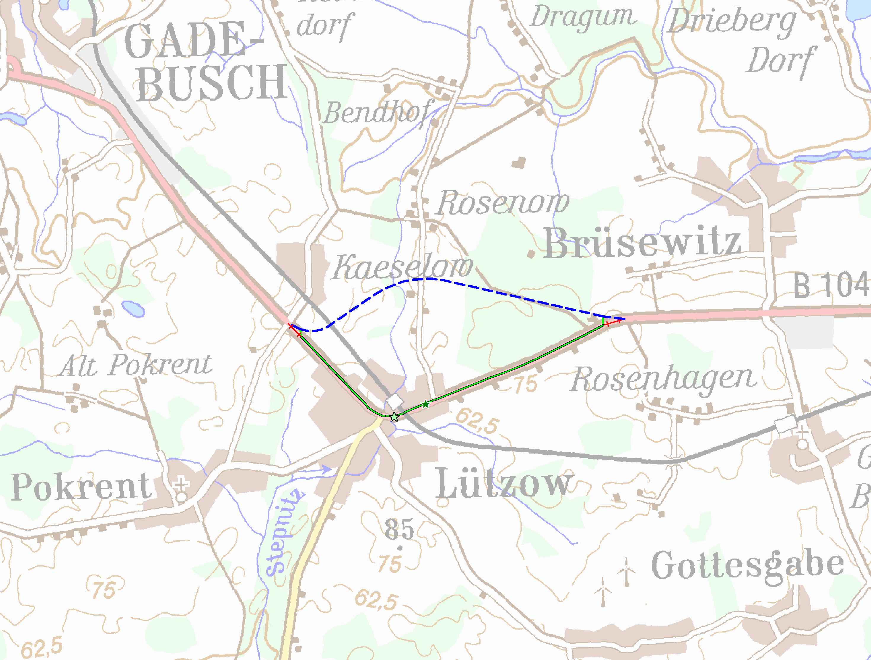 | Das Neubauprojekt liegt im Westen in einem von Acker geprägten Raum ohne besondere Umweltqualitäten und quert dann einen größeren Waldkomplex (Rosenower Fichten). Es befindet sich in ebenem Gelände. Die Trasse quert einen Großraum (Feuchtlebensräume) und einen Großsäugerlebensraum (BfN). | |