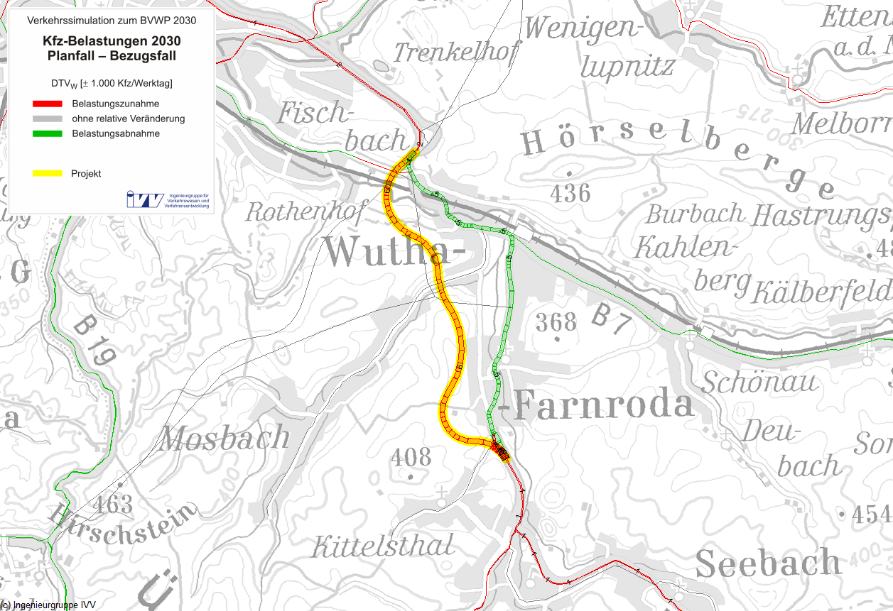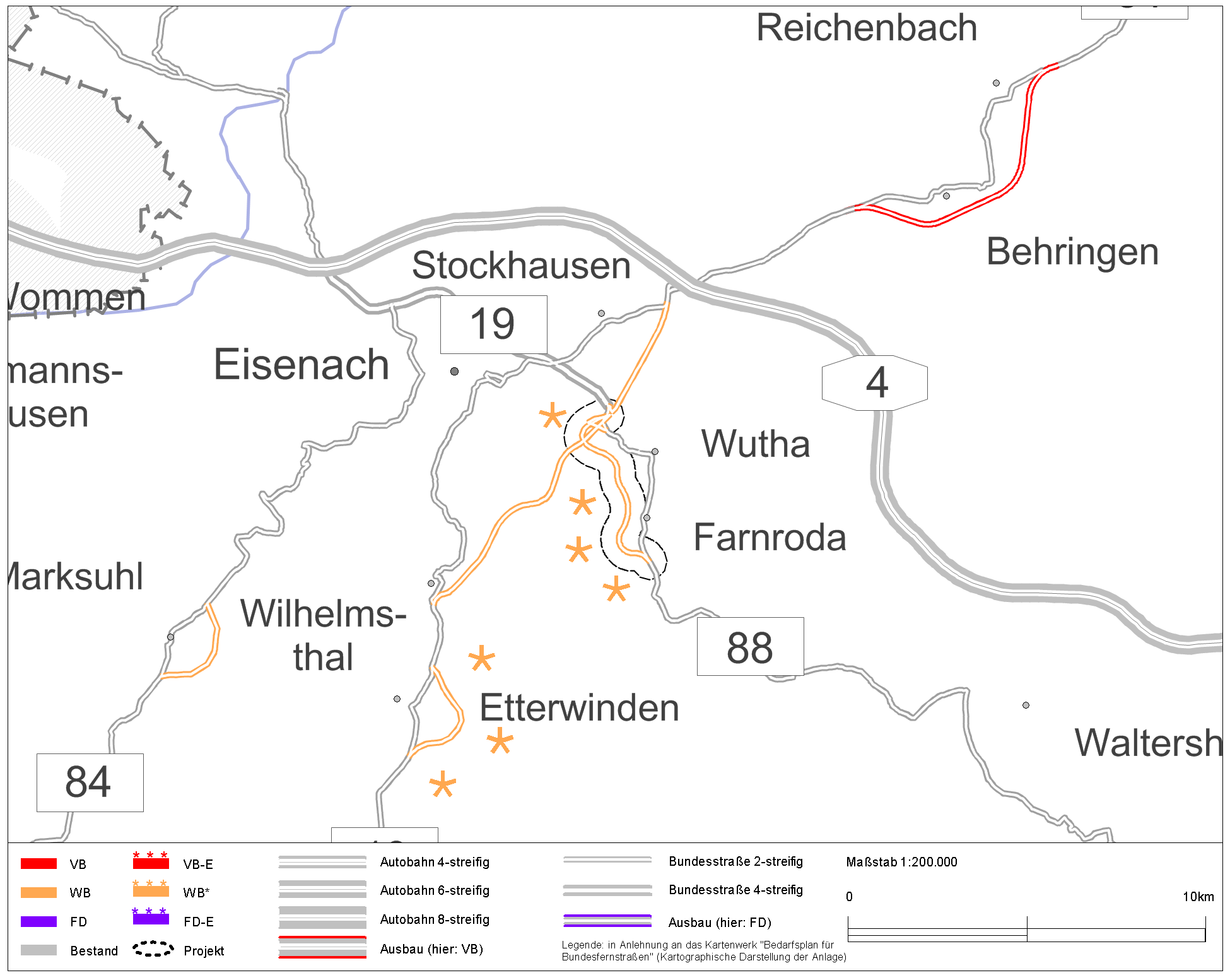 Das Verkehrsaufkommen im Zuge der Ortsdurchfahrt Wutha-Farnroda setzt sich aus Überregionalverkehren zwischen den Mittelzentren Eisenach und Ilmenau und in Richtung der europäisch bedeutsamen Straßenverbindung der A 4 (AS Eisenach-Ost, Eisenach-West und Sättelstädt) zusammen. Daneben liegen im Zuge der B 88 regionale Verkehre zwischen den Grundzentren Ruhla, Bad Liebenstein, Wutha-Farnroda und dem MZ Eisenach sowie städtische Verkehre. Der Durchgangsverkehrsanteil im Zuge der B 88 liegt bei 60 %. Aufgrund dieser Nutzungsüberlagerungen ist die Ortsdurchfahrt Wutha-Farnroda mit Verkehrsstärken von 8.750 bis 14.000 Kfz/24 h (SV-Anteil 7,7 %) über die Ortsverträglichkeit hinaus belastet. Bis zum Prognosejahr 2025 wird sich die Situation mit Verkehrsstärken von 8.950 bis 15.400 Kfz/24 h (SV-Anteil 12,1 %) noch verschärfen. Die Verkehrssituation in der OD ist aufgrund der engen Bebauung, insbesondere bei Begegnung von Lastfahrzeugen und Linienbussen unzureichend. Die Verkehrssicherheit für Fußgänger und Radfahrer ist wegen der schmalen Gehwege und fehlender Radverkehrsanlagen stark eingeschränkt und entspricht weder im Hinblick auf die Verkehrssicherheit noch in Bezug auf die Verkehrsqualität den Anforderungen an die Funktion der Straße als Überregionalverbindung. Zur Beseitigung der vorhandenen Sicherheitslücken und Engpässe ist die Neutrassierung der B 88 notwendig.