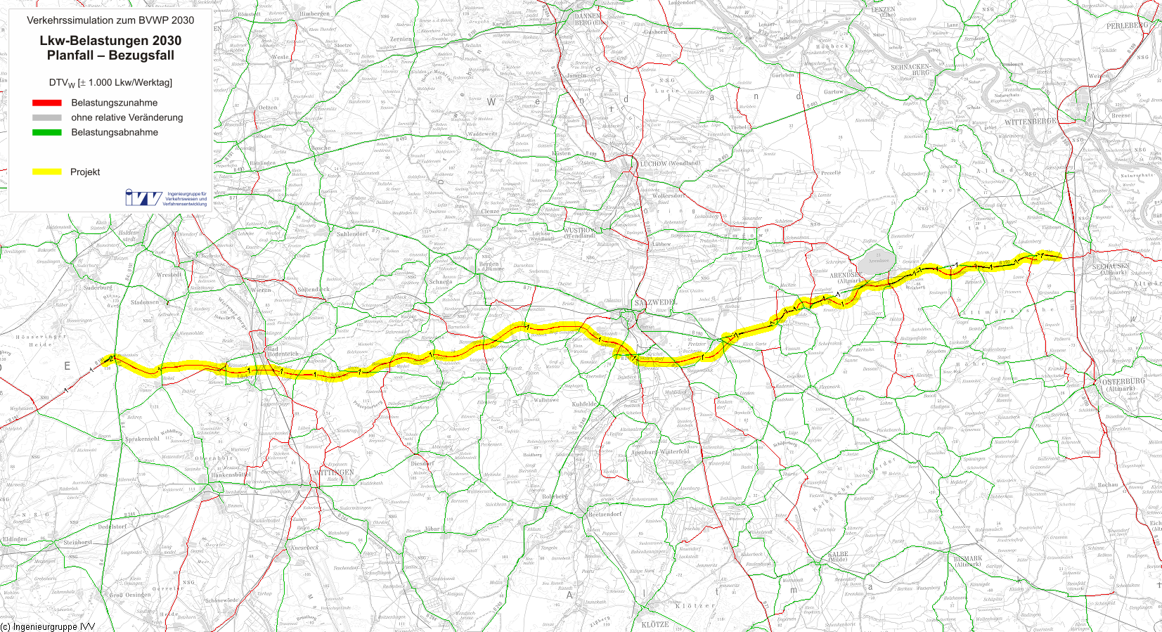 | Das länderübergreifende Neubau- und z.T. auch Ausbauprojekt verläuft von Seehausen (Altmark) in Sachsen-Anhalt in Richtung Westen bis zur Kreuzung der heutigen B 4/ B 191 bei Breitenhees. Im Trassenverlauf werden Waldgebiete sowie Acker und Grünland durchfahren. In T1 wird ein fließgewässerbegleitendes FFH-Gebiet entlang der Jeetze sowie eine Lebensraumachse (feucht) mittels Brückenbauwerk überspannt, erhebliche Beeinträchtigungen können lt. Ländermeldung ausgeschlossen werden. Mehrere Großsäugerfunktionsräume werden durchfahren. Die Trasse quert mehrere ÜSG. Weitere Konflikte resultieren aus der Durchschneidung mehrerer UZVR, v.a. durch T1, die Funktion der UZVR bleibt jedoch erhalten. Drei LSG sind randlich direkt betroffen. | |