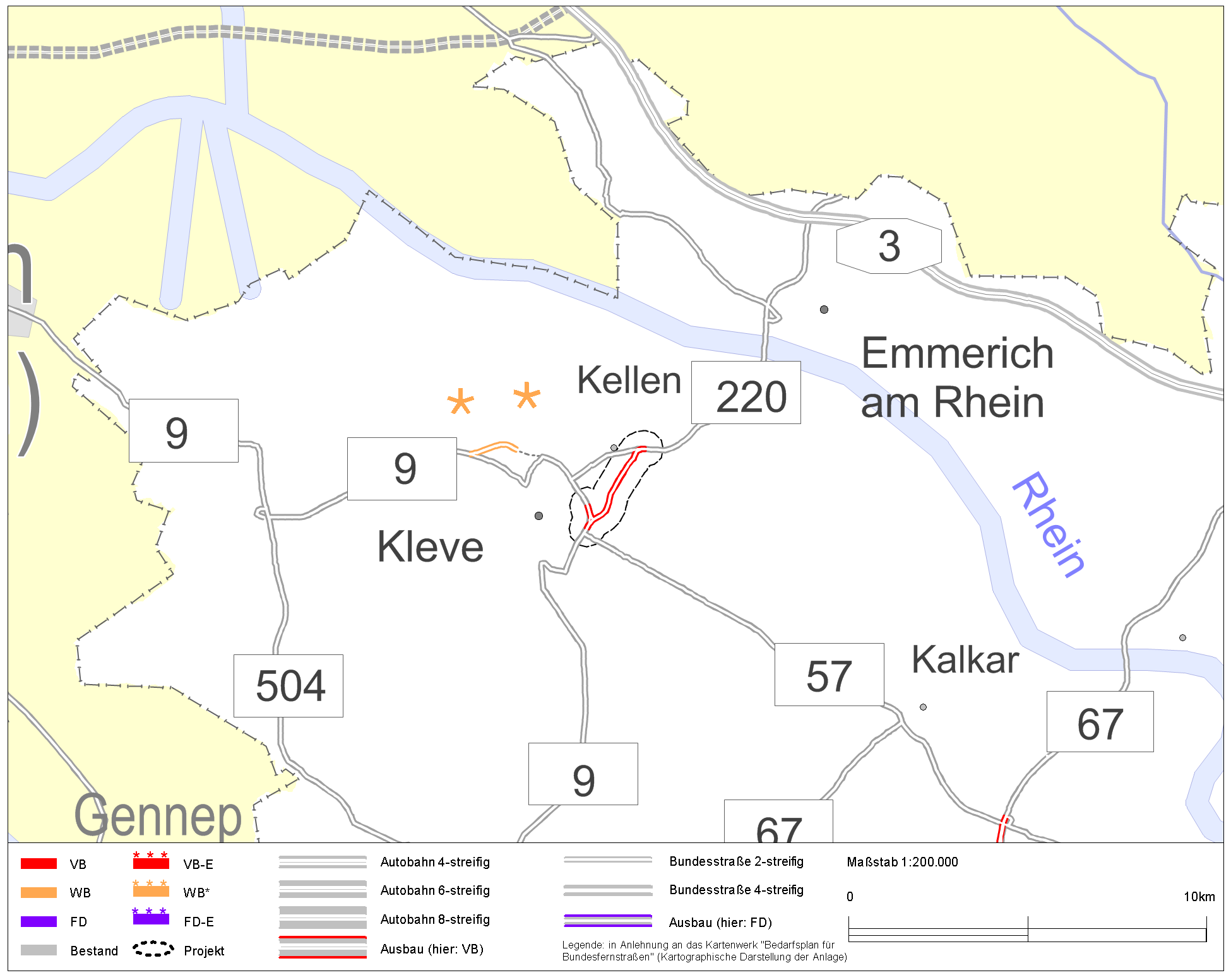 Die B 220 neu stellt eine von der B 57 kommend und bis zur vorh. B 220 verlaufende Entlastungsstraße (Ortsumgehung vom Klever Stadtteil Kellen) dar. Somit dient sie der Entlastung der Verkehre auf den städt. Straßen einschl. der Ortsla-gen der B 9 und B 220 und trägt damit auch zur Verbesserung der Verkehrssicherheit und Umweltbelastung bei. Die Maßnahme steht im Vordringlichen Bedarf unter Neue Vorhaben ohne besondere Einschränkung. Durch die geplante Ortsumgehung werden die bestehenden verkehrsbedingten Umweltbeeinträchtigungen (Lärm, Schadstoffemissionen) innerhalb der Ortslage Kellen verrin¬gert. Die aktuelle Verkehrsbelastung der B 220 beträgt in der Ortsdurchfahrt Kellen bis zu 21.000 Kfz / 24 h (Verkehrswirtschaftliche Untersuchung zur B 9n / B 220n, IGS, 2004). Für das Jahr 2025 sind für die geplante B 220n 14.000 Kfz / 24 h prognostiziert während für die bestehende B 220 11.600 Kfz / 24 h erwartet werden. Durch die geplan-te Ortsum¬gehung wird die Verkehrsmenge innerhalb der Ortslage nahezu halbiert. Nach Abschluss der Bauarbeiten wird die Frequentierung der B 220 im Siedlungsbereich sowie auf der als Abkürzung genutzten Kreuzhofstraße und die damit ver¬bundene sehr hohe Verkehrsdichte durch die dann zur Ver¬fügung stehende Umgehungsstraße deut-lich herabgesetzt.