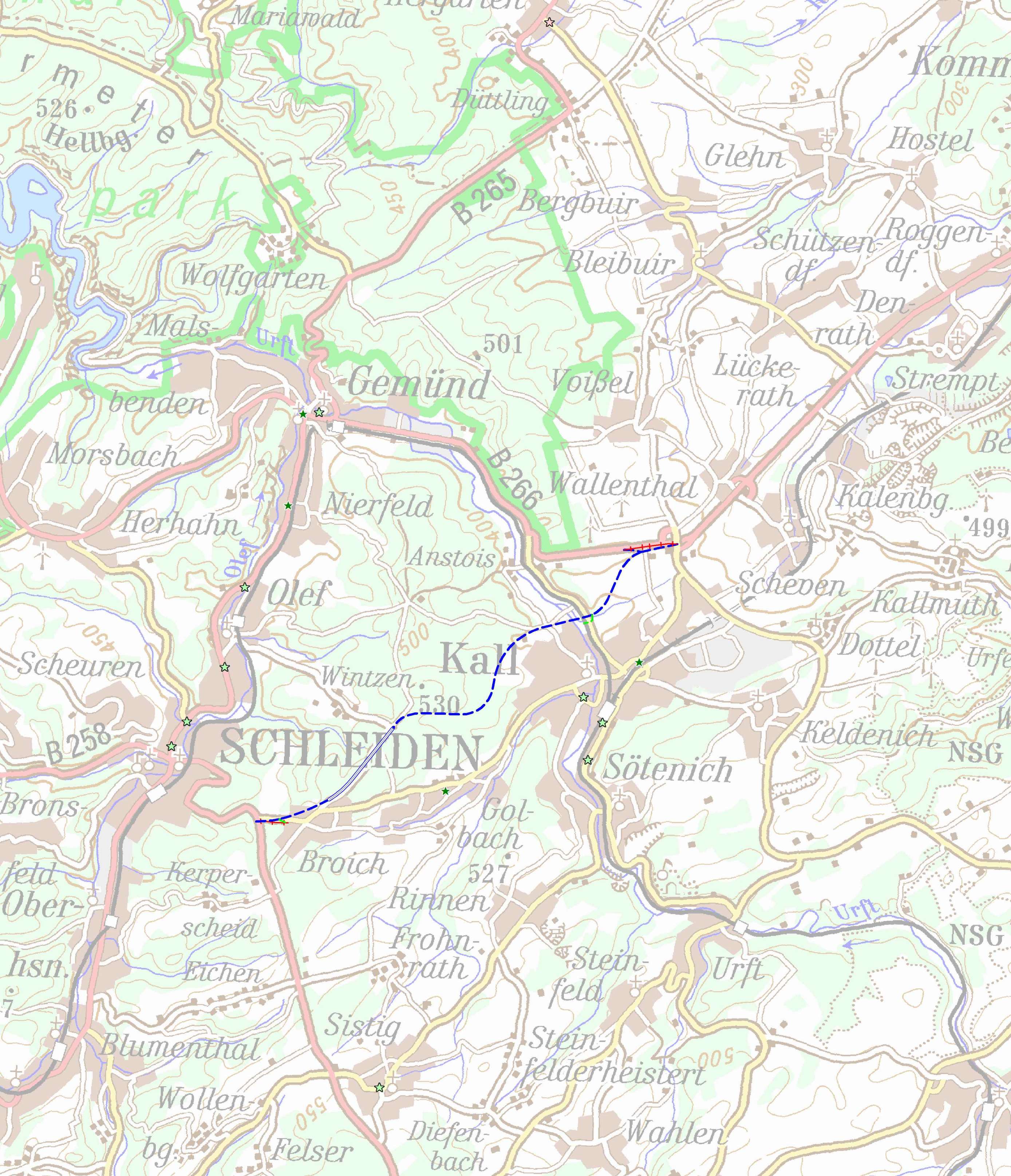 | Das Neubauprojekt liegt westlich und südwestlich von Kall in einer bewegten Landschaft. Nach dem Bauanfang durchfährt das Projekt erst Acker- und Grünland, quert anschließend die Niederung der Urft und fährt dann durch ein Waldgebiet (Olefer Kirchenwald). Ein Teil der Strecke im Wald verläuft im Bestand und wird nicht ausgebaut. Im Bereich der Urft-Niederung werden ein NSG und ein ÜSG überspannt. Weiter westlich, am Bauende, wird ein weiteres NSG randlich zerschnitten. Von der Niederung der Urft bis zum Bauende werden Großräume (Großsäuger-, Wald- und Feuchtlebensräume) (BfN) und Kernräume im Wald (Feuchtlebensräume, Waldlebensräume randlich) gequert. Zwei nationale Lebensraumkorridore, die sich nördlich der Streck vereinigen, werden gequert. Eine Grünbrücke ist vorgesehen. Ein kleines Teilstück durchfährt ein WSG der Zone II. Das Projekt liegt vollständig im LSG und im Naturpark. | |