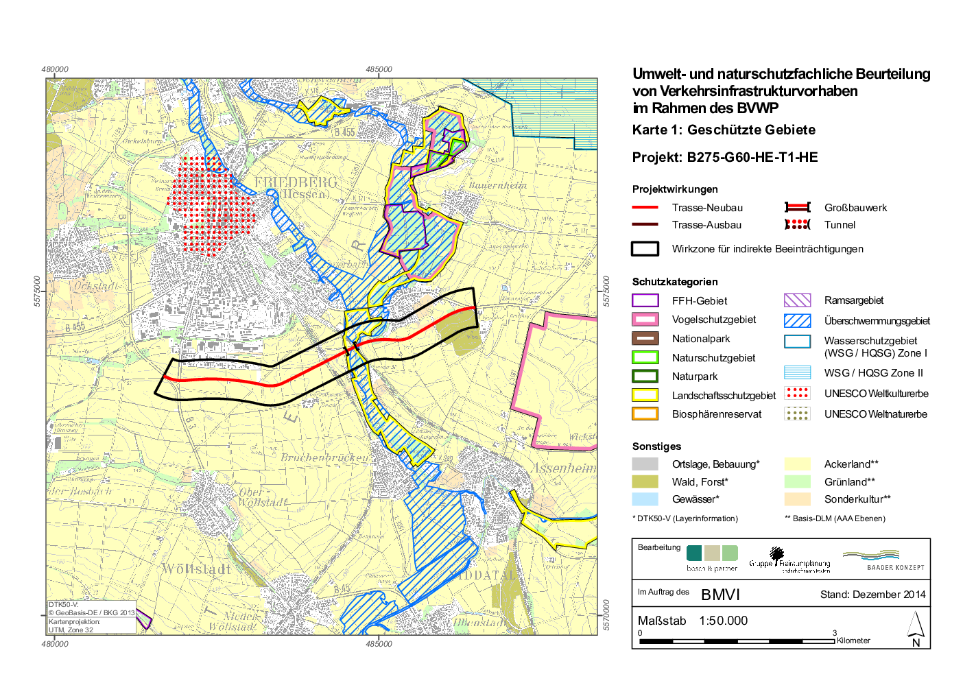 | Das Neubauprojekt verläuft südlich der Stadtteile Friedberg und Friedberg/Ossenheim auf landwirtschaftlich genutzter Fläche in hügeligem Gelände. Die Querung des Flusses Wetter und dessen ÜSG sowie eines überlagerten LSG wird mittels Brückenbauwerk entschärft. Insgesamt mittlere Umweltbeeinträchtigungen der Teilstrecke sind auf die Durchfahrung eines Heilquellenschutzgebietes der Zone I zurückzuführen. Weitere Bereiche mit besonderen Umweltqualitäten sind nicht betroffen. | |