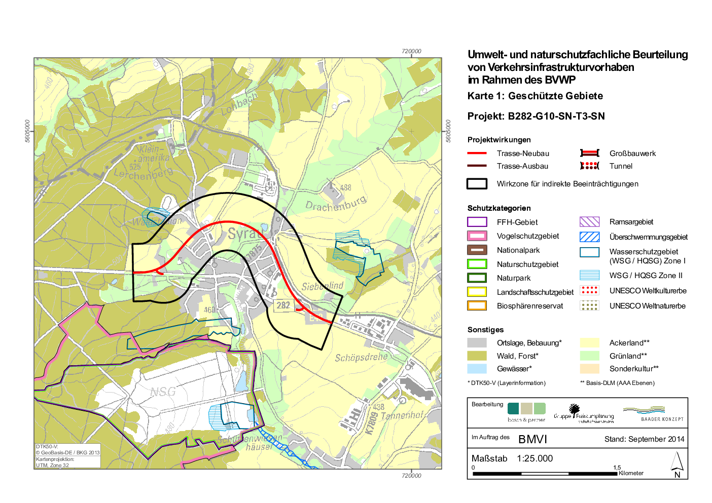 | Das Neubauprojekt durchfährt nördlich Syrau Ackerland und Grünlandbereiche, z.T. liegt es im Siedlungsgebiet. Seine Wirkzone reicht in Großräume hinein, gesetzliche Schutzgebiete sind nicht betroffen. | |