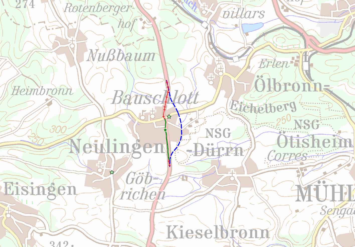 | Das Neubauprojekt der OU Bauschlott wird am östlichen Siedlungsrand errichtet. Der Offenlandbereich unterliegt überwiegend ackerbaulicher Nutzung. Östlich und südwestlich des Siedlungsbereichs werden Grünlandbereiche gequert. Ein Teil davon ist als NSG und FFH-Gebiet ausgewiesen. Beide Schutzgebiete werden randlich durchfahren bzw. mittels Großbrücke überspannt. Trotz der randlichen Durchfahrung können nach FFH-VP erhebliche Beeinträchtigungen des FFH-Gebiets ausgeschlossen werden. Weiterhin durchfährt die OU auf beinahe gesamter Länge randlich einen Großsäugerfunktionsraum. | |