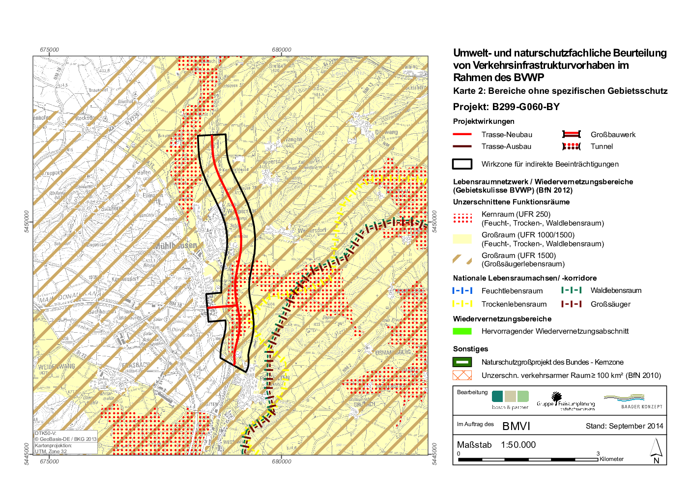 | Das Neubauprojekt umgeht Mühlhausen östlich. Es durchfährt Acker- und Waldflächen (Gidiholz) in ebener Landschaft und verläuft mit einigem Abstand parallel zum Ludwig-Donau-Main-Kanal. Groß- und Kernflächen werden gequert. Am Bauende liegt ein FFH- Gebiet in der Wirkzone, jedoch unverändert wie im Bestand der Bundesstraße. Beeinträchtigungen der schutzwürdigen Bereiche und Schutzgebiete wurden laut Angaben des Landes im Ausgleichskonzept berücksichtigt. Wegen der langen Durchfahrung des BfN-Lebensraumnetzwerks wird das Projekt mit "hoch" bzüglich der Umweltbetroffenheit bewertet. | |