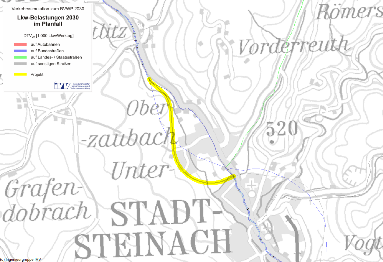 Nach Verwirklichung der OU Stadtsteinach und der OU Zaubach ist die B 303 im Lkr. KU zwischen der A 9 (AS Bad Berneck/ Himmelkron) und der Lkr.- grenze KU/KC frei von Ortsdurchfahrten. Mit dem Ausbau "Rugendorf- Seibelsdorf" und der OU Untersteinach wurden bereits erhebliche Investitionen in diesen Streckenzug getätigt. Durch Herausnahme des Durchgangsverkehrs aus der Ortslage ergibt sich ein erheblicher Gewinn an Verkehrssicherheit.