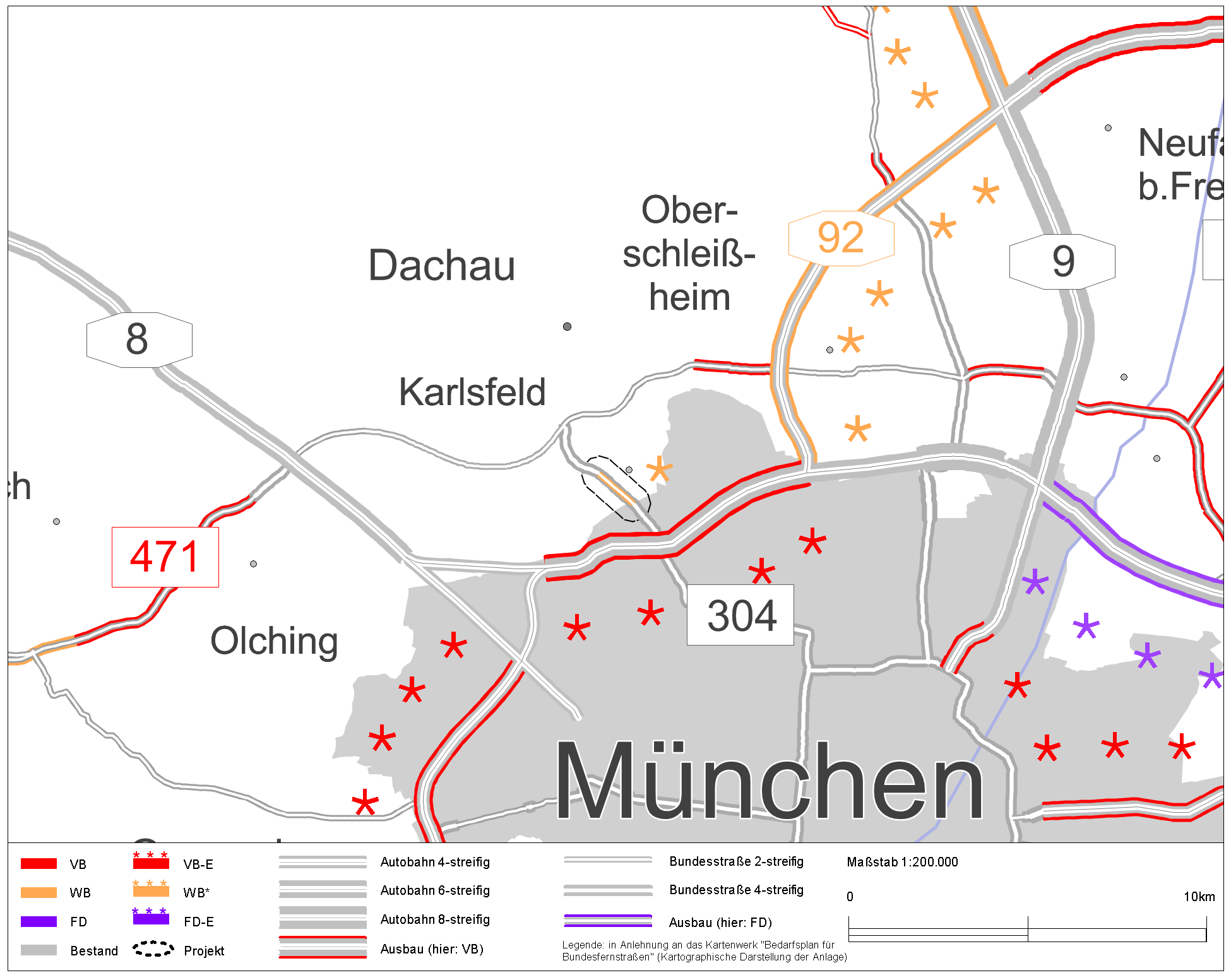| Das Neubauprojekt liegt südöstlich von Dachau. Im Bestand besteht bereits die B 304, der Neubau wird als Entlastungstunnel geplant, d. h. ein Großteil der Trasse ist untertunnelt. Das Projekt befindet sich innerhalb der Ortschaft. Umweltbetroffenheiten entstehen keine. | |