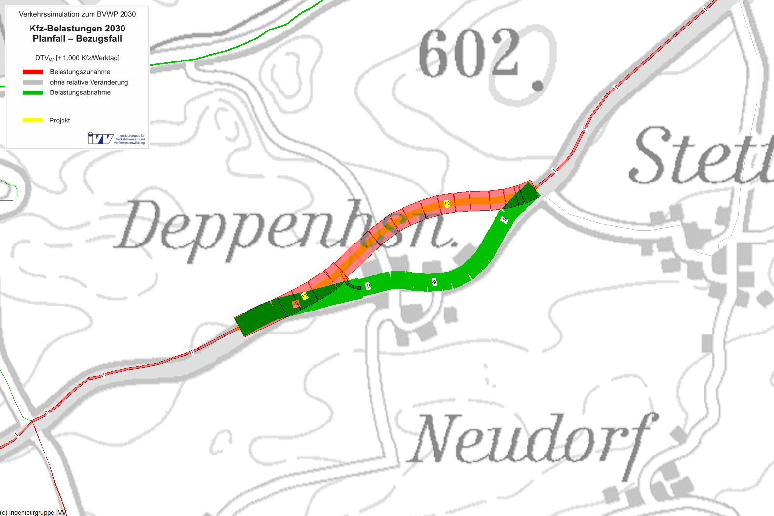 | Abb. 6: Querschnittsbezogene Kfz-Belastungsdifferenzen des DTVw zwischen dem Planfall und dem Bezugsfall 2030 |