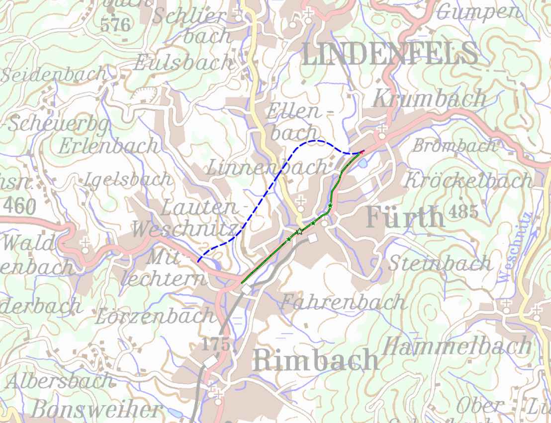 | Das Neubauprojekt verläuft nordwestlich von Fürth über Grünland und Acker und quert zwei Fließgewässer, die zu einem FFH-Gebiet gehören mit einer Großbrücke. Im Bereich des Bauendes ragt dieses FFH-Gebiet zusätzlich in die Wirkzone. Erhebliche Beeinträchtigungen können nicht ausgeschlossen werden. Gleichzeitig sind die Bereiche des FFH-Gebiets als NSG ausgewiesen. Am Bauende sind geringfügig Großräume (Wald- und Feuchtlebensräume, BfN) betroffen. Ebenfalls wird hier ein WSG der Schutzzone II durchfahren. Das Projekt liegt vollständig innerhalb eines Naturparks. | |