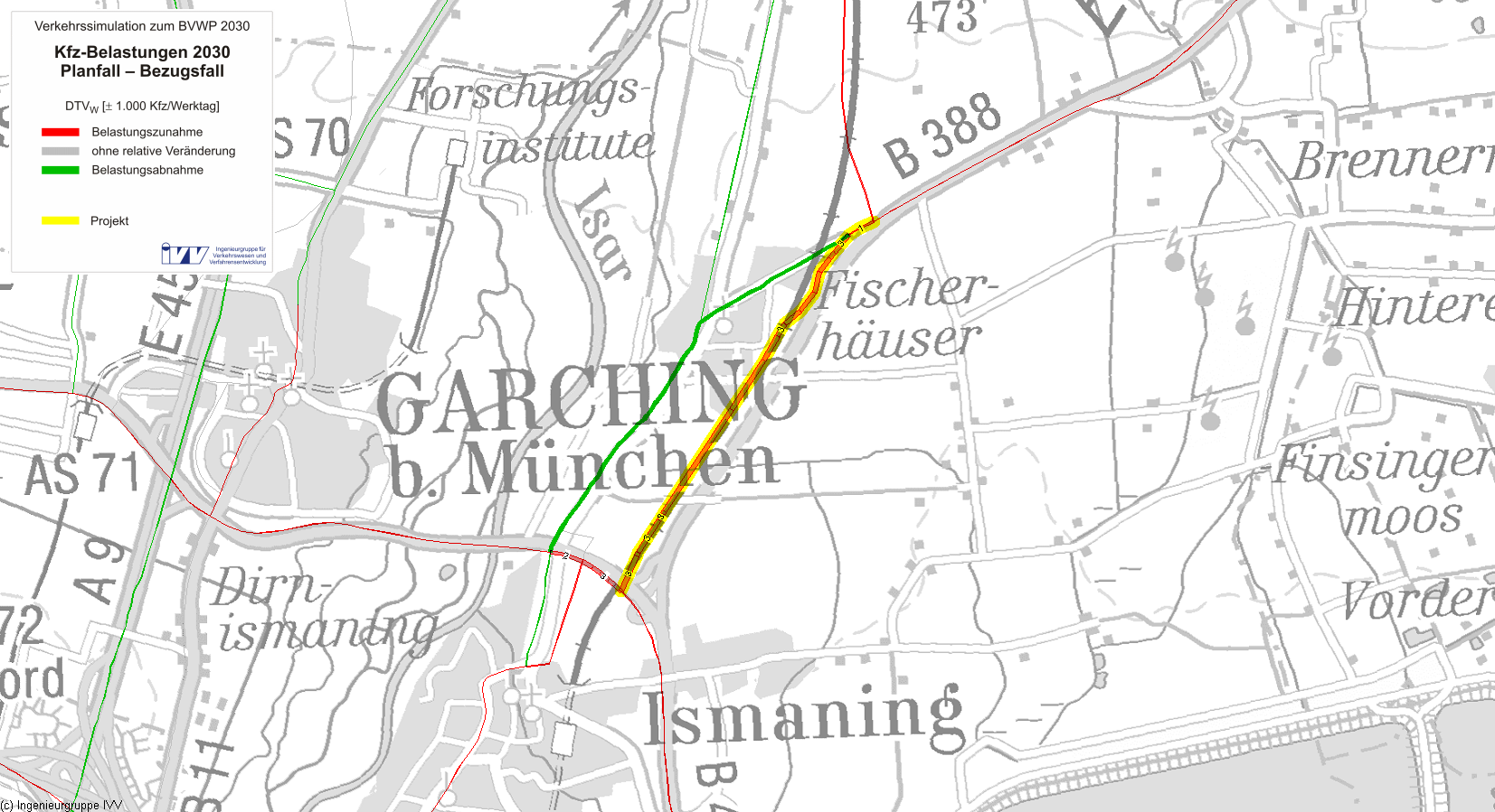 Die B 388 dient im betrachteten Bereich und in Weiterführung mit der B 301 als Zubringer zum Flughafen München. Ziel: Erhöhung Leistungsfähigkeit und Verkehrssicherheit der B 388 als Teil der Bundesfernstraßenverbindungen zwischen Flughafen und dem Oberzentrum München durch Beseitigung des verkehrlichen Engpasses im Überlagerungsbereich beider Bundesstraßen B 301 und B 388.Notwendigkeit: Anstieg der Passagierzahlen am Flughafen München seit Eröffnung 1992 von 12 auf 38 Mio. Passagiere im Jahr 2012. Planfeststellungsbeschluss vom 26.07.2011 zum Bau der dritten Start- und Landebahn (derzeit in der gerichtlichen Überprüfung). Ausbau von Terminal 2 seit Frühjahr 2012, bauliche Fertigstellung für 2015 geplant.Dadurch weiter steigende Verkehrsbelastungen auf allen Verkehrsträgern in der Flughafenregion.Prognose Werktag 2025: 27.000 Kfz/24hQualitätsstufe (HBS): F im Prognosenullfall, angestrebt D