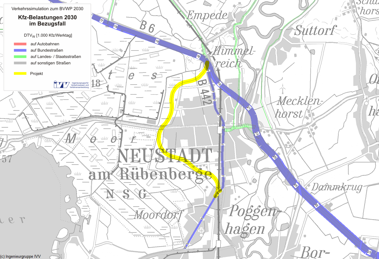Die Projektbegründung basiert auf dem Verfahren zur Bewertung von OD (UVO). Erhebungszeitraum der Daten: Verkehrszahlen: 2005; Unfalldaten:2005-2007; Sonstiges: ab 1992. Im Bereich der bestehenden Ortsdurchfahrt NEUSTADT 442 ergeben sich erhebliche Mängel. Die vorhanden B 442 verläuft durch den Kernbereich von Neustadt. Der DTV liegt abschnittsweise bei etwa 15232 Kfz/24 h mit einem Lkw-Anteil von 6,2%. Aus verkehrlicher Sicht bestehen deutliche Mängel bezüglich der Verkehrssicherheit sowie erhebliche Auswirkungen auf den Verkehrsablauf. In einigen Abschnitten der Ortsdurchfahrt wurden sowohl auffällig viele Unfälle mit Personenschaden, als auch überdurchschnittlich viele Unfälle beim Überschreiten der Fahrbahn festgestellt. Die V85% liegt mit 65km/h abschnittsweise deutlich über der zulässigen Höchstgeschwindigkeit von 50km/h. Bedingt durch Halte an plangleichen Knotenpunkten und Bahnübergängen liegt die mittlere Reisegeschwindigkeit in einigen Abschnitten der bestehenden Ortsdurchfahrt lediglich bei 7,7km/h. Nennenswerte Mängel im Straßenumfeld ergeben sich durch einen deutlich erhöhten Grad der Lärmimmissionen (70,5dB(A) am Tag, 63,1dB(A) in der Nacht) und die durch Fahrzeuge hervorgerufenen Abgasimmissionen (13,6CO2 mg/m³). Die geplante Maßnahme führt in allen Bereichen zu der angestrebten Entlastung der Ortsdurchfahrt.