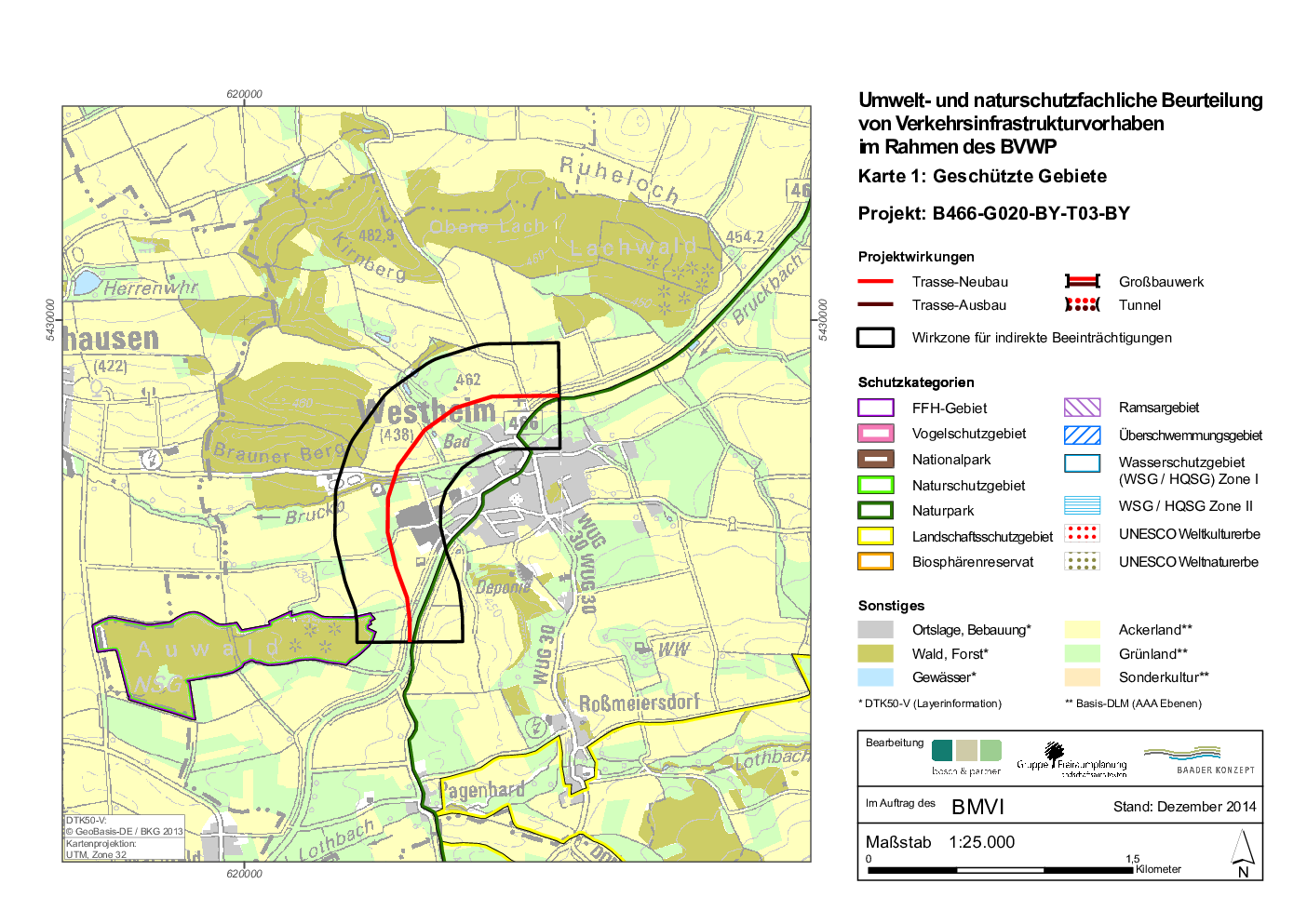 | Das Neubauprojekt umgeht Westheim westlich und liegt fast ausschließlich auf ebenem Ackerland, nur teilweise auf Grünland. Im Südwesten liegt ein FFH-Gebiet, das auch NSG und Kernraum (Feuchtlebensräume) (BfN) ist, in der Wirkzone. Erhebliche Beeinträchtigungen können nicht ausgeschlossen werden. Es verläuft überwiegend durch Großräume (Feucht- und Großsäugerlebensräume, teilweise Waldlebensräume) (BfN). Im Osten liegt ein Naturpark in der Wirkzone. | |