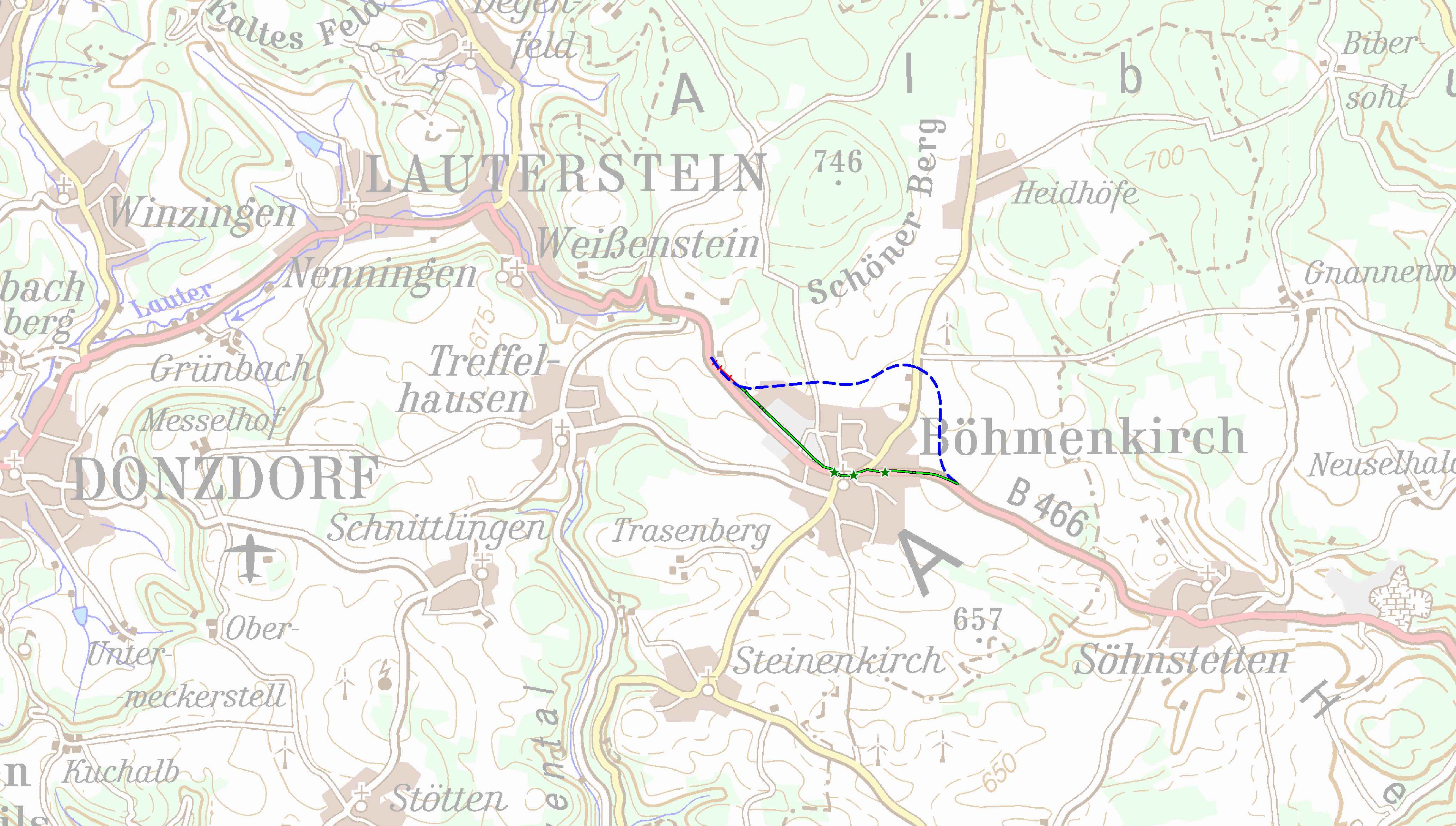 | Die Neubaustrecke stellt die Nordvariante zur Umfahrung von Böhmenkirch dar. Sie zweigt südlich von einem Steinbruch in Acker- und Grünland ab und berührt im weiteren Trassenverlauf bei einer Kapelle randlich ein kleines LSG mit Hecken und Gehölzen. Aus Umweltsicht ergeben sich mittlere Beeinträchtigungen eines BfN-Großsäugerfunktionsraumes sowie eines BfN-Großraumes (Trocken) bei den Abzweigungen von der Bestandstrecke. Weitere Bereiche mit besonderen Umweltqualitäten sind nicht betroffen. | |
