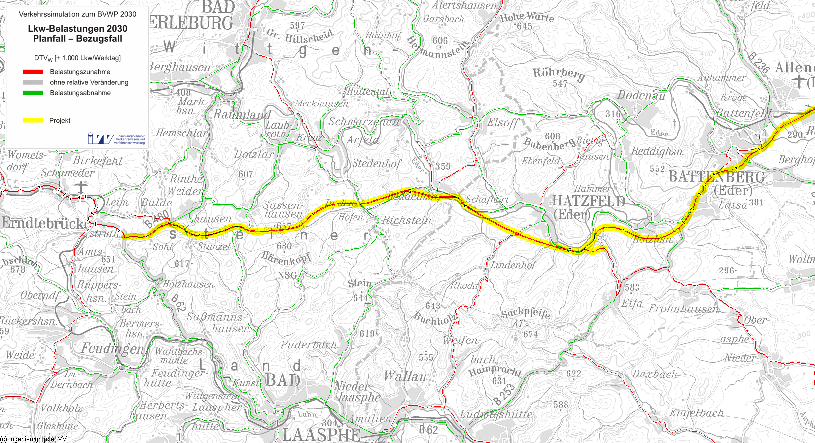 Die OU ist im aktuellen Landesentwicklungsplan von Nordrhein-Westfalen und im aktuellen Regionalplan von Hessen enthalten. Im Zuge des Neubaus der OU Erndtebrück/Schameder-Frankenberg stellt sich eine deutliche Entastungswirkung bezüglich des Verkehrsaufkommens (Durchgangsverkehr) ein. Ebenfalls wird sich dadurch der vorhandene SV-Anteil verringern. Es wird eine deutliche Verkehrsberuhigung erreicht und die Funktionsfähigkeit der innerörtlichen Straßen und Knotenpunkte wiederhergestellt. Damit einhergehend verringert sich innerhalb der Ortschaften die Unfallgefahr. Positive Auswirkungen ergeben sich für das Schutzgut Mensch (Reduzierung Lärm, Abgase usw.) sowie für den Durchgangsverkehr bezüglich Reisezeit und Pünktlichkeit.