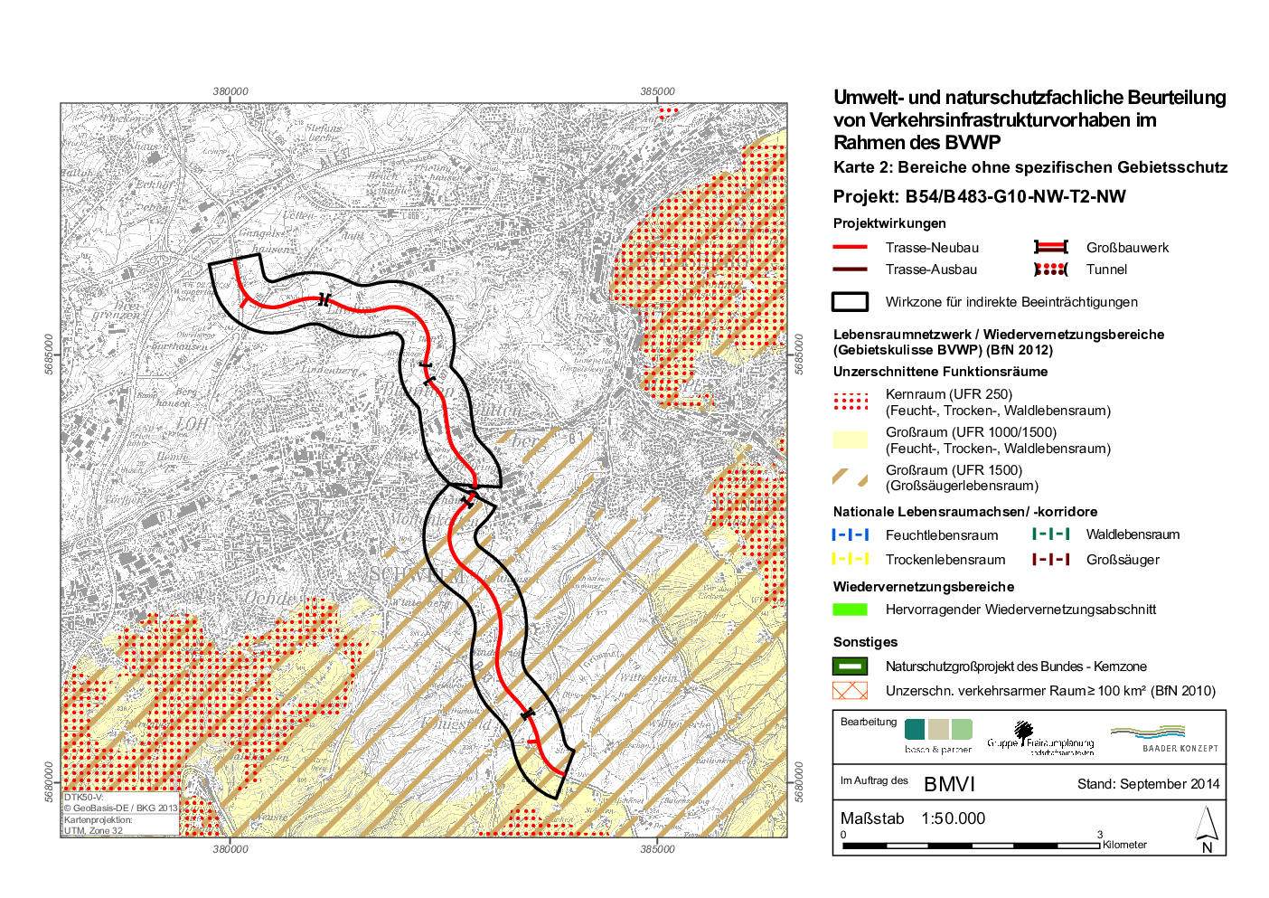 | Neubauprojekt in räumlich heterogenen Raum mit landwirtschaftlichen Nutzungen sowie Waldanteilen, u.a. auch mit Querung von Siedlungsraum. Betroffen sind Großräume (zwei Feuchtlebensräume, ein Waldlebensraum) sowie zwei Großsäugerlebensräume (BfN). Es werden darüber hinaus Flächen eines LSG in Anspruch genommen/ befinden sich innerhalb der Wirkzone des Vorhabens für indirekte Beeinträchtigungen. | |
