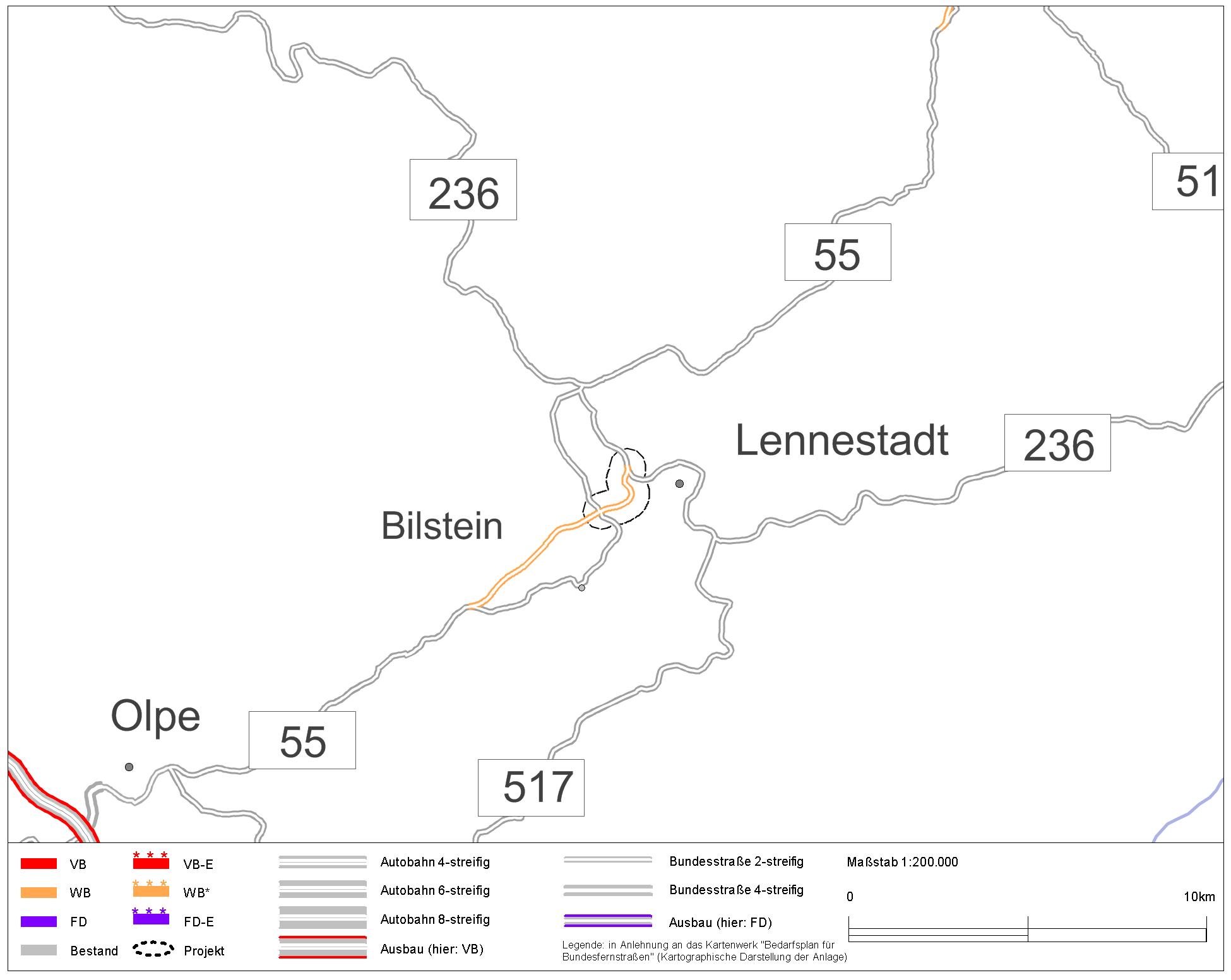 Durch die BÜ Beseitigung in Lennestadt – Grevenbrück wird eine zusätzliche für die verkehrliche Entlastung der B 55 und B 236 erforderliche Querspange zwischen der B 55 und der B 236 südlich des Ortskerns von Grevenbrück notwendig. Aufgrund der topografischen Gegebenheiten und da eine Querverbindung im Zuge der „Ladestraße“ nicht möglich war, konnte diese nächstliegend nur in Höhe von Bonzel (B 55) und Maumke (B 236) gesucht werden. Die hier gefundene Linienführung ist die nach den gegebenen topografischen Verhältnissen beste Lösung unter Berücksichtigung der notwendigen Straßenneigungen und des damit verbundenen Eingriffs in den Naturraum. Die Linienführung wurde im jetzigen Planungsstadium mit der Stadt Lennestadt und der ULB, Kreis Olpe, vorab grob abgestimmt. Ohne die hier beschriebene Querverbindung müsste der Durchgangsverkehr aus den Richtungen Finnentrop und Elspe in Richtung A 4 trotz OU Grevenbrück durch den Ortskern fahren. Die Entlastungswirkung der Ortslage würde somit nicht gewährleistet.