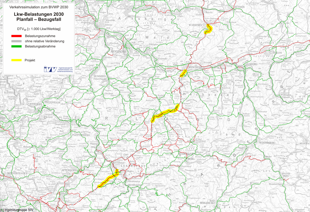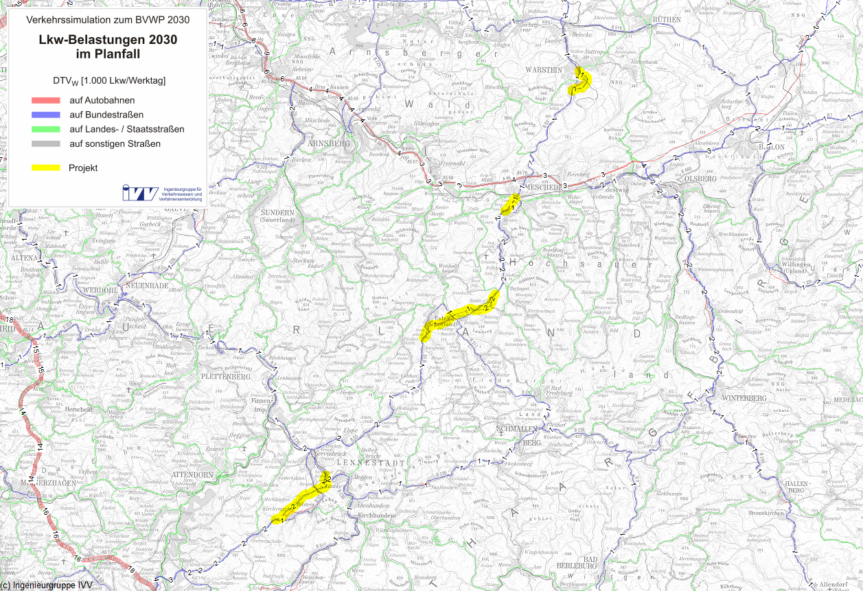 Südwestfalen weist ein vorhandenes oder in Bau u. Planung befindliches gutes Ost-West-Straßennetz auf (A2, A44, A46/B7n/B480n, A4/B508n/B62) auf. Die B55 ist die einzige Nord-Süd-Verbindung im mittl. Westfalen, die diese Verkehrsachsen von Anröchte/Warstein nach Olpe verbindet. Mit einem Beschäftigtenanteil im prod. Gewerbe von 48% liegt diese Region in Deutschland auf Rang 3. Sie ist ebenso die führende Tourismusregion in NRW. Die B55 weist in vielen Teilen nicht den Standard auf, um die für die Verbindungsfunktion erforderl. Reisegeschwindigkeiten zu erreichen u. um der Wertigkeit des Raumes gerecht zu werden. Um die wirtschaftl. Leistungsfähigkeit zu erhalten u. zu erweitern sowie die Tourismusregion zu stärken, ist der Streckenzug der B55 in großen Teilen zu ertüchtigen. Folgende Projekte sind erforderlich: B55 OU Kirchveischede u. Bilstein, B55 Bonzelerhammer - Maumke (B236), B55 OU Eslohe, B 55 OU Bremke, B55 OU Reiste, B55 OU Meschede, B55 OU Warstein. Insbes. die OD’en sind hohen Verkehrsbel. ausgesetzt, die in wesentl. Teilen vom Durchgangs- u. da vom Schwerverkehr geprägt sind. Auch sind einige Teilabschnitte immer wieder zu Unfallhäufungspunkten geworden, da keine ausreichende Trassierung der Strecken o. keine Überholmöglichkeiten gegeben sind. Richtlinienkonform trassierte OU’en u. Neubauabschnitte steigern die Verkehrssicherheit deutlich.