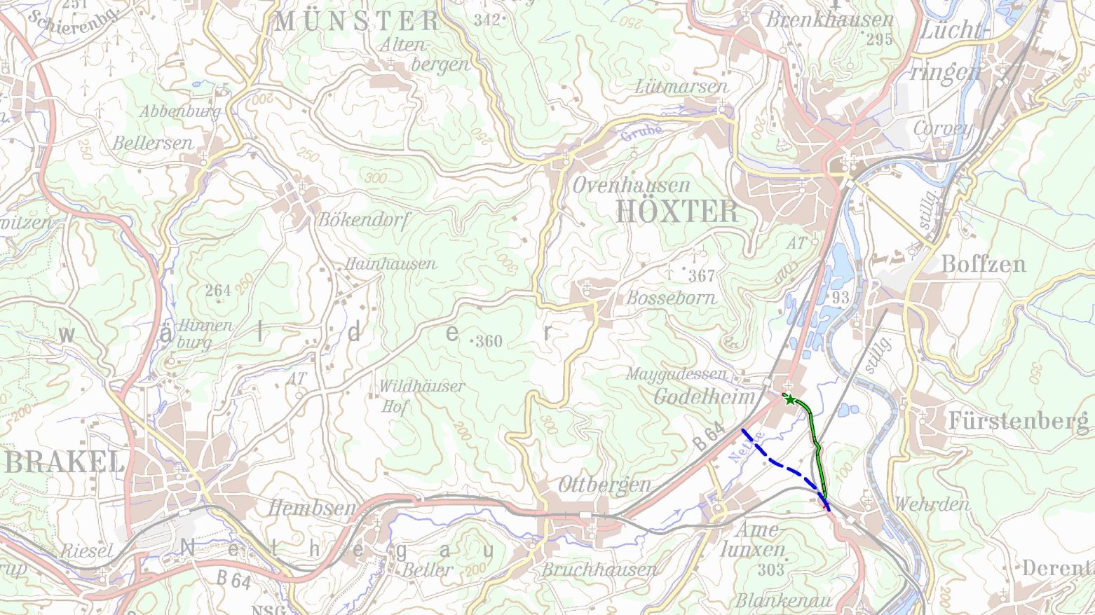 | Das Neubauprojekt verläuft zwischen Godelheim und Amelunxen über hügeliges, landwirtschaftlich genutztes Gebiet und quert dabei die Aue der Nethe, die als FFH-Gebiet und NSG ausgewiesen ist. Erhebliche Beeinträchtigungen sind wahrscheinlich. Das gesamte Vorhaben liegt in einem BfN-Großraum (Großsäuger) sowie in einem LSG und Naturpark. Die geplante Trasse schneidet das großräumige ÜSG der Nethe. | |