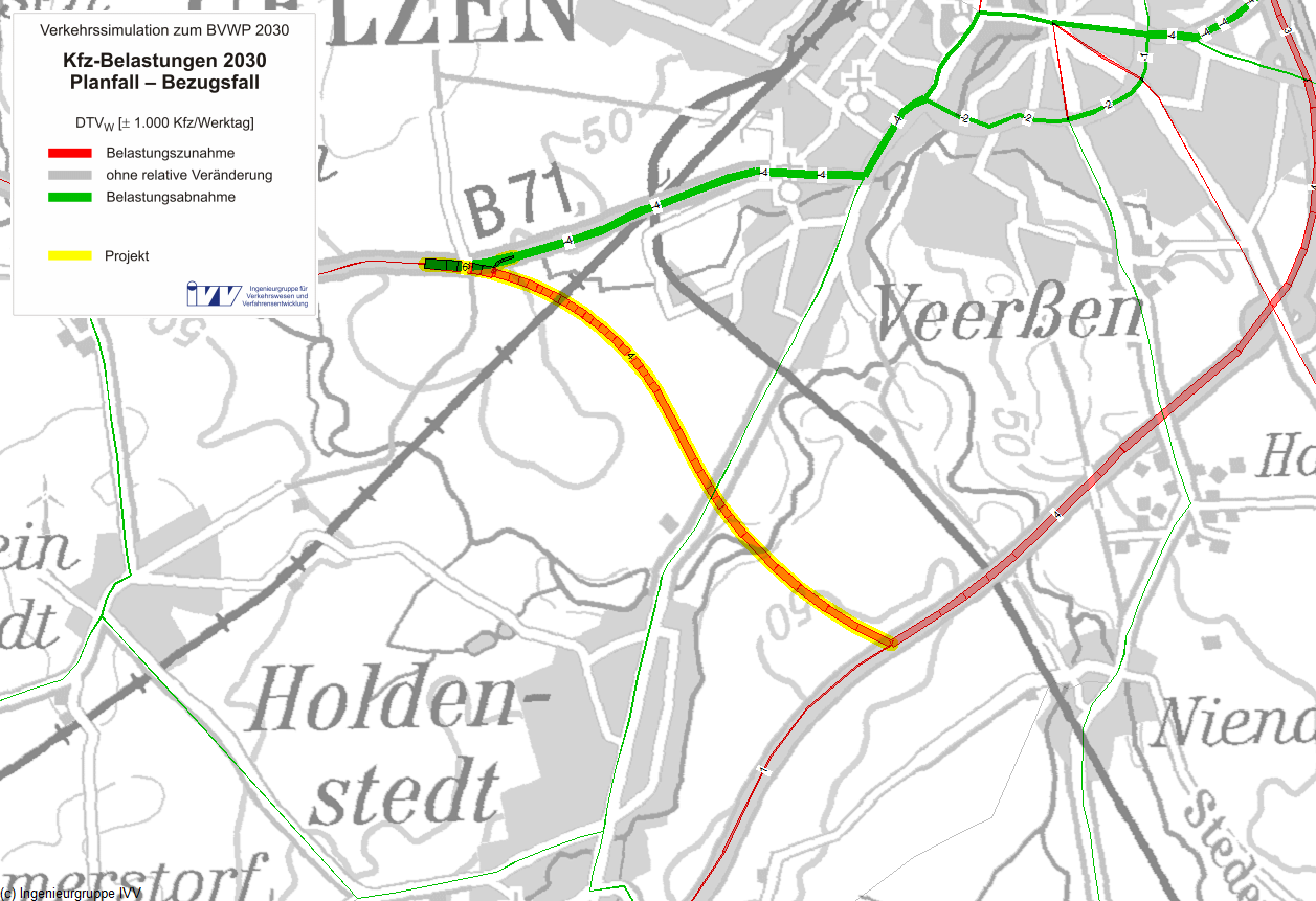 Die Projektbegründung basiert auf dem Verfahren zur Bewertung von OD (UVO). Erhebungszeitraum der Daten: Verkehrszahlen: 2005, Unfalldaten:2005-2007, Sonstiges: ab 1992. Im Bereich der bestehenden Ortsdurchfahrt UELZEN ergeben sich Mängel. Der DTV liegt abschnittsweise bei etwa 7000 Kfz/24 h mit einem Lkw-Anteil von 8,6%. Die V85% liegt mit 70km/h abschnittsweise deutlich über der zulässigen Höchstgeschwindigkeit von 50km/h. Nennenswerte Mängel im Straßenumfeld ergeben sich durch einen deutlich erhöhten Grad der Lärmimmissionen (66,0dB(A) am Tag, 58,6dB(A) in der Nacht). Die geplante Maßnahme führt in allen Bereichen zu der angestrebten Entlastung der Ortsdurchfahrt.