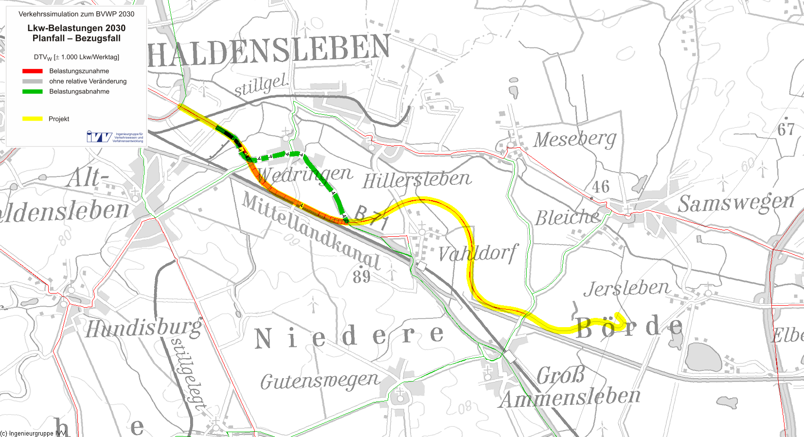 Die B 71n ist Bestandteil der im Ergebnis der VUNO (Verkehrsuntersuchung Nordost, 1994, 1995, Aktualis. 2002) ausgewiesenen Gesamtnetzgestaltung mit der sogenannten "Hosenträger-Variante" als Vorzugslösung. Diese sieht neben der Verlängerung der Bundesautob. A 14 und A 39 in nördl. Richtung den Aus- bzw. Neubau leistungsfähiger B-Straßen in Ost-West bzw. Nordost-Südwest Relation vor. Der Gesamtverkehrszug B 71/B71n Uelzen (NI)-Gardelegen-Haldensleben-Magdeburg (ST) wird durch den Neubau der B71n Haldensleben-A 14 aufgewertet u. mit der gepl. A 14 verknüpft. Durch die große Zahl an Gewerbeansiedlungen in Haldensleben u. dem damit sehr hohen Anteil an SV zw. Haldensleben-A14 sind die Ortslagen (OL) Groß Ammensleben, Wedringen, Vahldorf (tang.) sehr stark belastet. Durch die vorh. plangl. KP innerhalb u. außerhalb der OL kommt es zu großem Rückstau auf der B 71 u. im nachgeordneten Netz. In Wedringen kommt es zu starken Behinderungen an der vorh. LSA. Der Querschnitt der vorh. Mittellandkanalbrücke entspricht nicht dem gewachsenen Verkehrsaufkommen. Durch geringe Verkehrsqualität u. damit verbundenen geringen Reisegeschwindigk. ist die notwendige Leistungsfähigkeit der B 71 nicht gegeben. Durch erhöhten Überholdruck kommt es vermehrt zu Unfällen, so das eine leistungsfähige Anbindung von Haldensleben an die A 14 erforderlich ist.