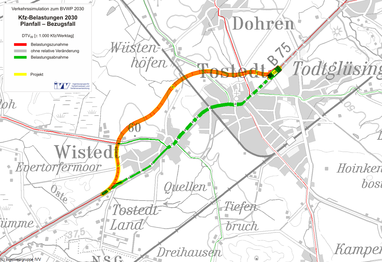 Die Projektbegründung basiert auf dem Verfahren zur Bewertung von OD (UVO). Erhebungszeitraum der Daten: Verkehrszahlen: 2005, Unfalldaten: 2005-2007, Sonstiges: ab 1992. Im Bereich der bestehenden Ortsdurchfahrten Tostedt und Wistedt ergeben sich erhebliche Mängel. Der DTV liegt abschnittsweise bei etwa 15000 Kfz/24 h mit einem Lkw-Anteil von 15,9 %. Aus verkehrlicher Sicht bestehen deutliche Mängel bezüglich der Verkehrssicherheit sowie erhebliche Auswirkungen auf den Verkehrsablauf. In einigen Abschnitten der Ortsdurchfahrt wurden sowohl auffällig viele Unfälle mit Personenschaden, als auch überdurchschnittlich viele Unfälle beim Überschreiten der Fahrbahn festgestellt. Die V 85% liegt mit 65 km/h abschnittsweise deutlich über der zulässigen Höchstgeschwindigkeit von 50 km/h. Bedingt durch Halte an plangleichen Knotenpunkten und Bahnübergängen liegt die mittlere Reisegeschwindigkeit in einigen Abschnitten der bestehenden Ortsdurchfahrt lediglich bei 9,1 km/h. Nennenswerte Mängel im Straßenumfeld ergeben sich durch einen deutlich erhöhten Grad der Lärmimmissionen (72,5 dB(A) am Tag, 65,1 dB(A) in der Nacht) und die durch Fahrzeuge hervorgerufenen Abgasimmissionen (12,7 CO2 mg/m³). Die geplante Maßnahme führt in allen Bereichen zu der angestrebten Entlastung der Ortsdurchfahrt.