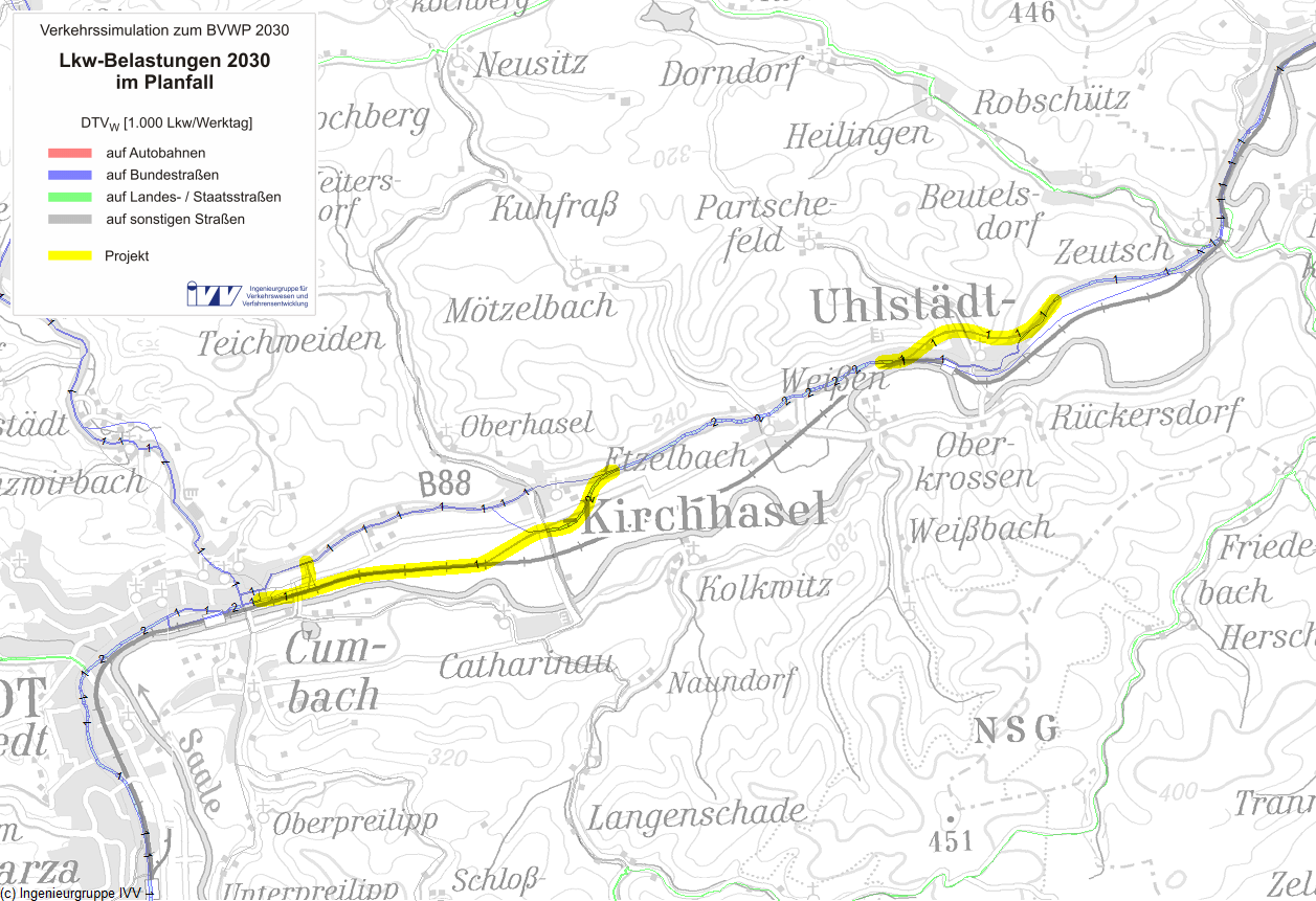 Für die Entwicklung des autobahnfernen Wirtschaftsstandortes Städtedreieck am Saalebogen (Saalfeld, Rudolstadt, Bad Blankenburg) ist die Verbesserung der verkehrlichen Erschließung von besonderer Bedeutung. Angesichts dessen sollen der Verkehrsfluss i.Z. der B 88 zwischen Rudolstadt und der A 4 AS Jena-Göschwitz verbessert werden. Daher wurde bereits die AS Jena-Göschwitz einschl. des sich anschließenden Ausbauabschnittes bei Maua an die verkehrlichen Gegebenheiten angepasst (in Bau) und die OU Rothenstein (Bezugsfall BVWP 2015) einschl. des Ausbauabschnittes bis Kahla zum Baurecht gebracht. Im weiteren Verlauf der B 88 sind die OU Großeutersdorf, Zeutsch Uhlstädt und Kirchhasel vorgesehen. Die vorhandenen Ortsdurchfahrten sind mit ihrer Lage im Saaletal durch begrenzte Flächenverfügbarkeiten mit eng geschlossener Bebauung im Straßenseitenraum und durch viele Zufahrten geprägt. Die Verkehrsstärken liegen zw. 6.200 und 9.500 Kfz/24 h (SV-Anteil von 8 bis 10 %). Neben der eingeschränkten Verkehrsqualität und Verkehrssicherheit für den Durchgangsverkehr bestehen hohe Belastungen für die Anwohner durch Verkehrslärm, Erschütterungen u. Abgase. Durch die geplanten Vorhaben werden die OD entlastet sowie die Verkehrssicherheit und die Verkehrsqualität verbessert. Im Prognosejahr werden i.Z. der Neubaustrecke Verkehrsstärken von 9.700 bis 10.200 Kfz/24 h (SV-Anteil 14 - 16 %) erwartet.