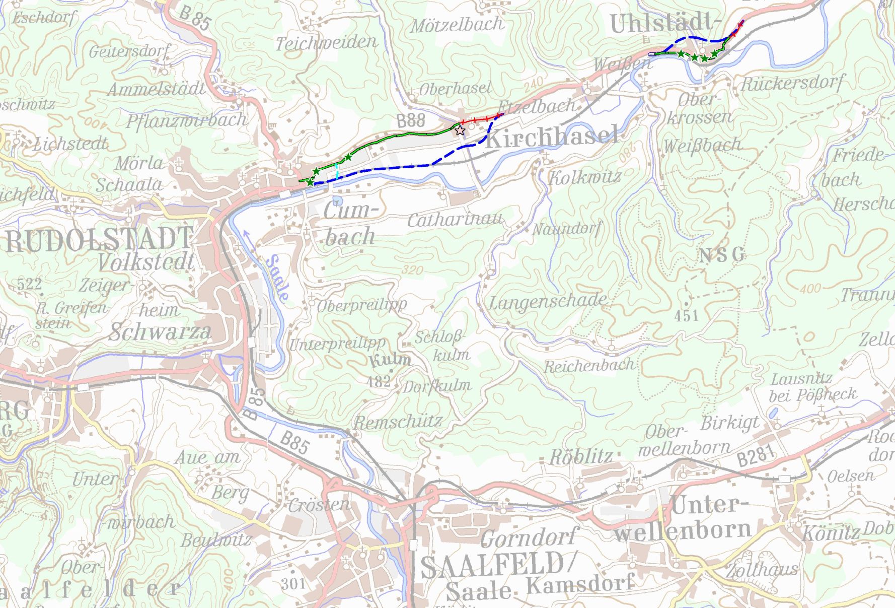 | Das Neubauprojekt verläuft sowohl über landwirtschaftlich genutzte Flächen als auch innerhalb von Wald- und Siedlungsbereichen. Es quert einen Kernraum (BfN) für Wald- und Trockenlebensräume. Großflächiger werden Großräume in Anspruch genommen (Trocken-, Wald-, Großsäugerlebensräume). In der Wirkzone wird ein kleinflächiges Überschwemmungsgebiet zwischen Rudolstadt und Kirchhasel mit Hilfe eines Brückenbauwerkes überquert (T2). Ein UZVR wird angeschnitten, in diesem Bereich sind zwei Tunnelabschnitte mit einer Gesamtlänge von 1,1 km vorgesehen. Außerhalb dieser liegt die Trasse auf oder nah am Vorbelastungskorridor der bestehenden B 88. Der UZVR bleibt mit einer verbleibenden Restgröße von > 100 km² erhalten. (T1) | |