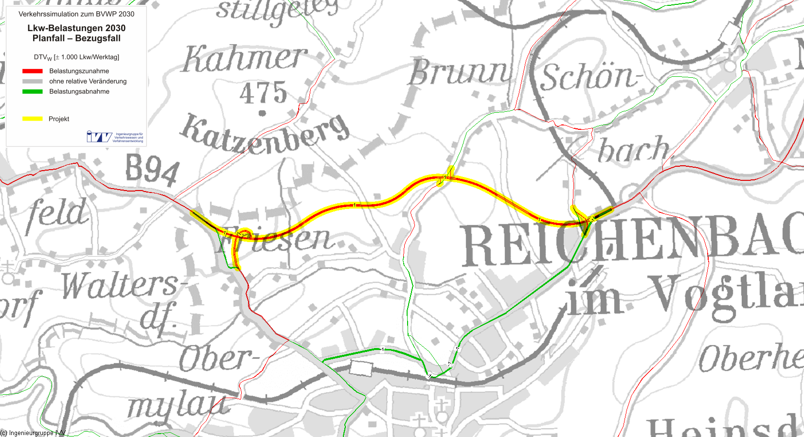 Durch die Überlagerung von Verbindungs- und Erschließungsfunktionen auf der B 94 und der B 173 sowie deren unstetiger Führung (zahlreiche Abbiegevorgänge, teilweise starke Kurvigkeit), wird keine der Verbindungsfunktion entsprechende Verkehrsqualität erreicht. Hinzu kommt, dass für Anwohner an der angebauten B 94 und der B 173 hohe Belastungen durch Lärm, Abgase und Trennwirkung auftreten. Die Anbindung von Greiz (Mittelzentrum) an die A 72 erfolgt über die B 94. Mit deren Verlegung wird die Verbindungsqualität auf der regionalen Achse zwischen A 72 und dem Mittelzentrum (Verbindungsfunktionsstufe II) maßgeblich erhöht. Außerdem wird diese regionale Achse auf optimale Weise mit der überregionalen Verbindungsachse auf dem Abschnitt Reichenbach - Oberzentrum Zwickau und der im Ausbau befindlichen „Westtrasse“ A 72 - Reichenbach - Werdau - Crimmitschau – A 4 verknüpft. Neben den genannten Zielen ist die Maßnahme erforderlich, um die volle Verkehrswirkung der 2007 freigegebenen Ostumfahrung Reichenbach zu erzielen. Damit wird die bestehende Infrastruktur voll ausgelastet und Verkehrsströme werden sinnvoll gebündelt. Die Verlegung der Bundesstraße bewirkt eine hohe Entlastung der B 94 und teilweise auch der B 173 in der Ortslage Reichenbach.