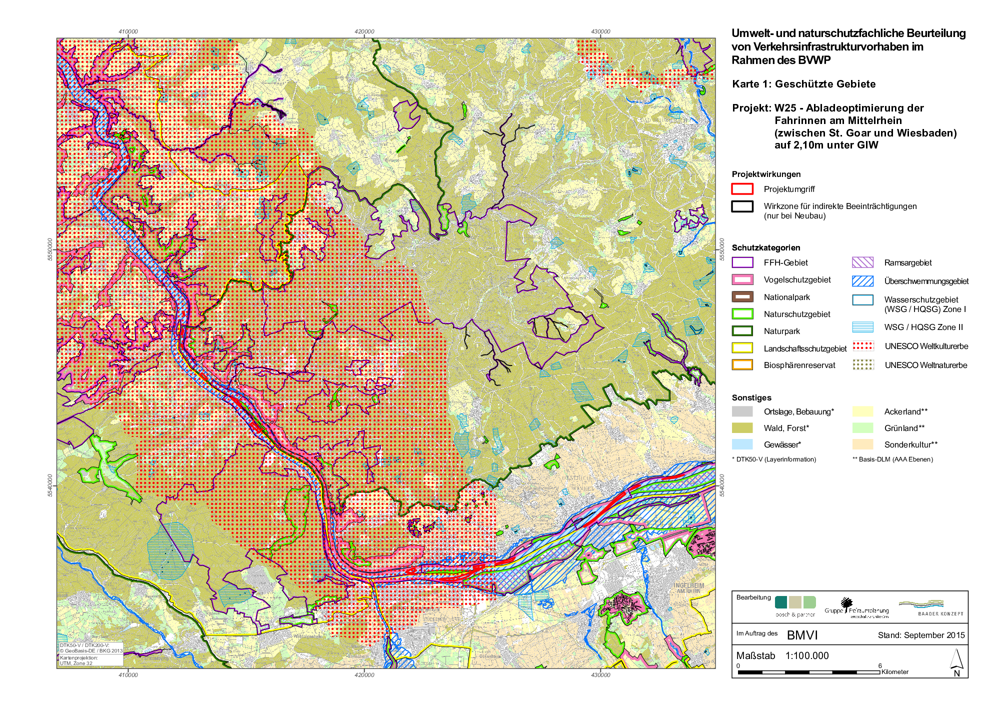 | Abladeoptimierung der Fahrrinnen am Mittelrhein (zwischen St. Goar und Wiesbaden) auf 2,10 m unter GlW. Erhöhung der Fahrrinnentiefe um 20 cm unter GlW und damit Angleichung des Streckenabschnitts an die ober- und unterstromigen Bereiche. Ausbaumaßnahme mit Felsabtrag, Längsbauwerken und Baggerungen. Durch das Vorhaben sind die FFH-Gebiete "Mittelrhein", "Wanderfischgebiete im Rhein" und "Rheinniederung Mainz-Bingen" sowie die Vogelschutzgebiete "Inselrhein" und "Rheinaue Bingen-Ingelheim" betroffen. Wasserqualität, Gewässerdynamik und die Durchgängigkeit des Wasserkörpers werden vorhabenbedingt nicht beeinträchtigt. Erhebliche nachteilige Auswirkungen auf die Fischfauna und den LRT sind im Fall der FFH-Gebiete nicht zu erwarten. Die geplanten Leitwerksvorbauten/-verlängerungen erweitern fischökologisch hochwertige Flachwasser- bzw. vor Schiffswellen geschützte Bereiche. Eine erhebliche Beeinträchtigung der Vogelschutzgebiete kann nicht ausgeschlossen werden (Wasservögel). Einzelne Projektflächen liegen bereichsweise innerhalb von unzerschnittenen Kernräumen (Bfn, feucht). Es liegen jedoch ausschließlich aquatische Eingriffe vor."Eine Beeinträchtigung der unzerschnittenen Kernräume kann ausgeschlossen werden. Östlich Rüdesheim ist die Wasserfläche des Rheins bereichsweise als unzerschnittener BfN-Großraum (feucht) ausgewiesen. Eine dauerhafte Beeinträchtigung der BfN-Lebensraumnetzwerke ist hierdurch nicht zu erwarten. Der Rhein selbst stellt eine BfN-Lebensraumachse (feucht) dar. Eine Zerschneidung durch das Projekt ist nicht gegeben. Es werden ausschließlich Flächen innerhalb des Flusswasserkörpers in Anspruch genommen, so dass eine Beeinträchtigung von ÜSG und Kulturvorrangflächen ausgeschlossen werden kann. Weitere Bereiche mit besonderen Umweltqualitäten sind nicht betroffen.